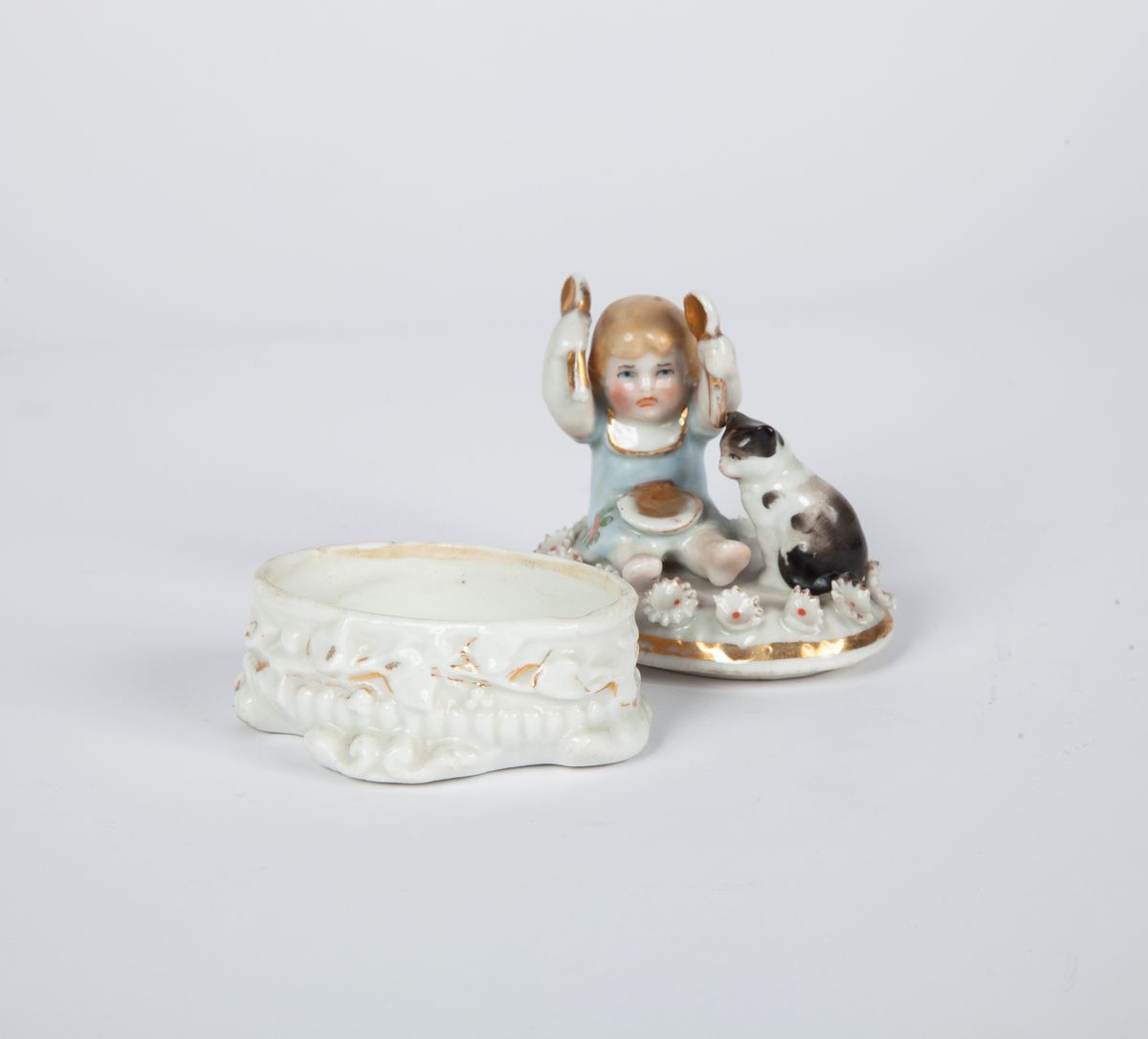 di forma ovale irregolare, arricchita da piccole corolle e sormontata da coperchio con figure di bimba con gattino. Lievi difetti e doratura consunta