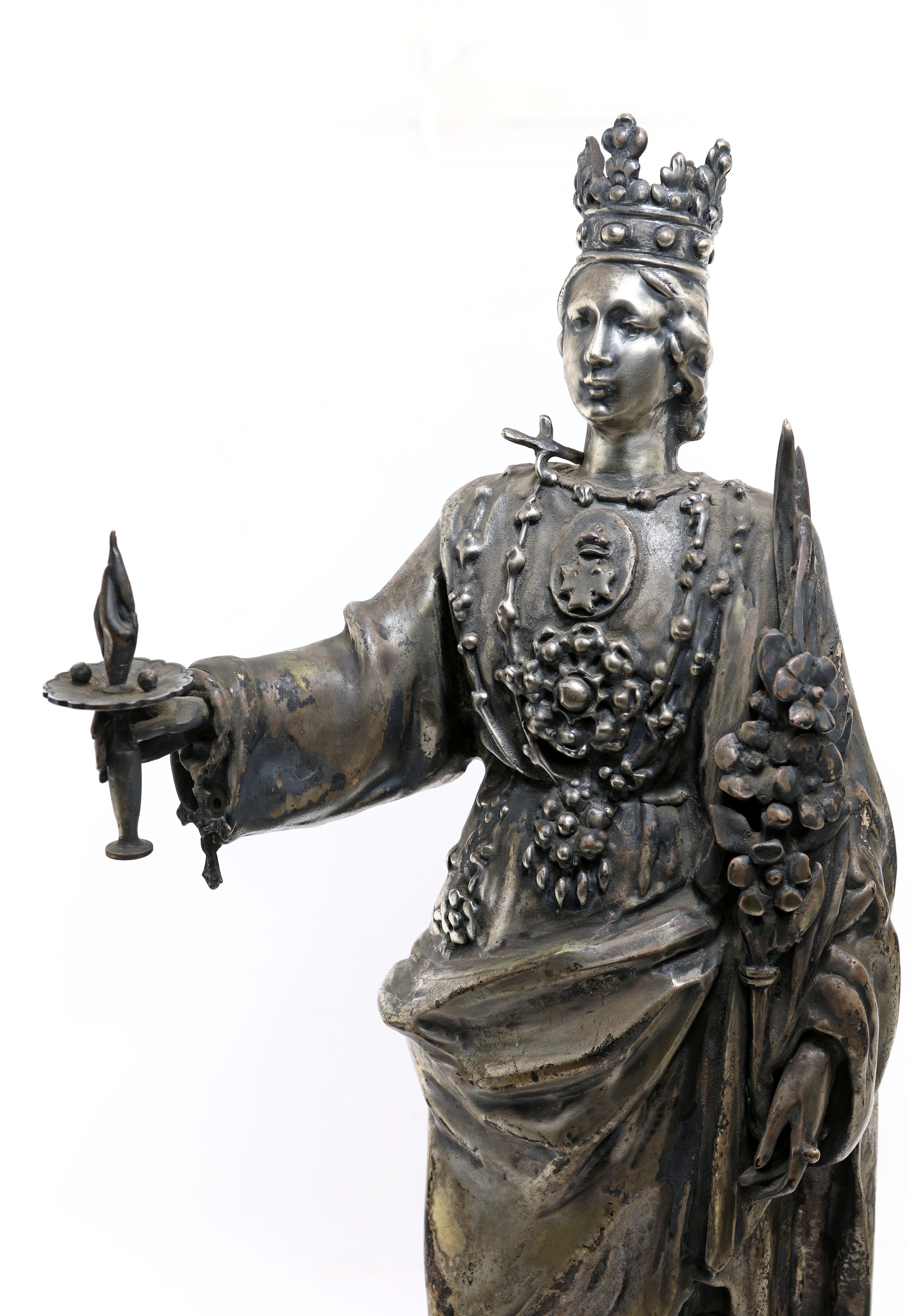 la figura trae ispirazione dall'opera orafa di Pietro Rizzo realizzata a Palermo e custodita nella nicchia della cappella a lei dedicata nel Duomo di Siracusa; la Santa è ritratta con la testa coronata ed un pugnale che le trafigge il collo; la mano destra sostiene la coppa con i due occhi separati da una fiamma, mentre la sinistra regge un ramo di palma e un giglio; alto piedistallo squadrato