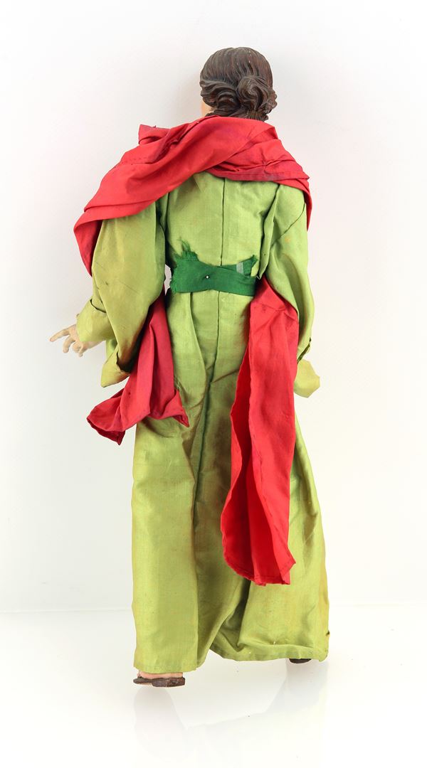 abbigliata con tunica verde trattenuta in vita da fusciacca in contrasto e stola rosso porpora