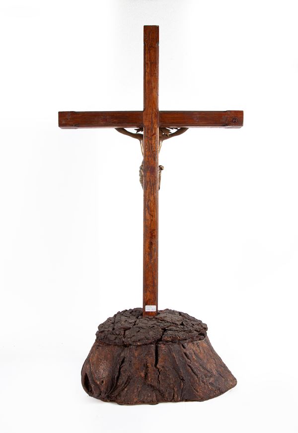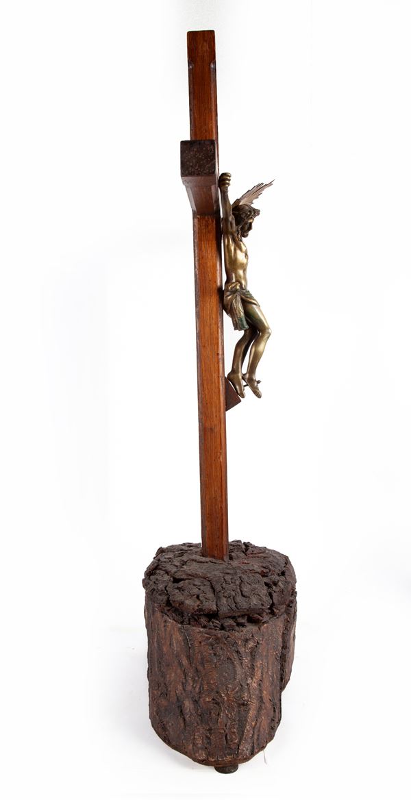 ritratto secondo l'iconografia classica con la testa lievemente ripiegata verso la spalla destra ed i piedi sovrapposti; aureola a raggiera; croce in legno naturale su base in cartapesta laccata simulante la roccia