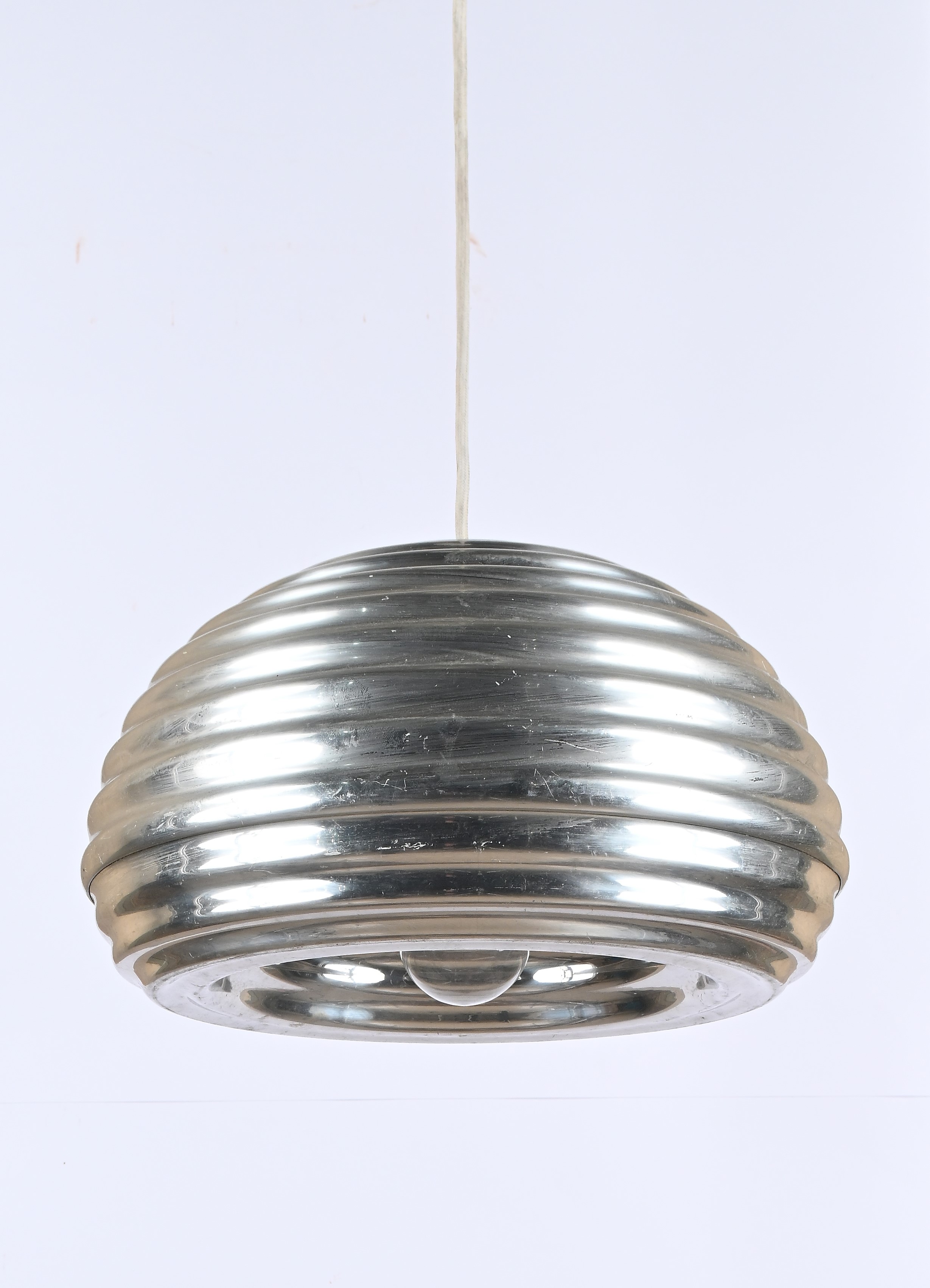 Lampada a sospensione con riflettore in alluminio tornio in lastra. Produzione Flos