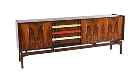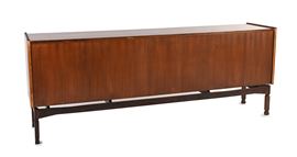 Mobile sideboard in noce con 4 cassetti scorrevoli con maniglie in ottone e dettagli in pelle colarata