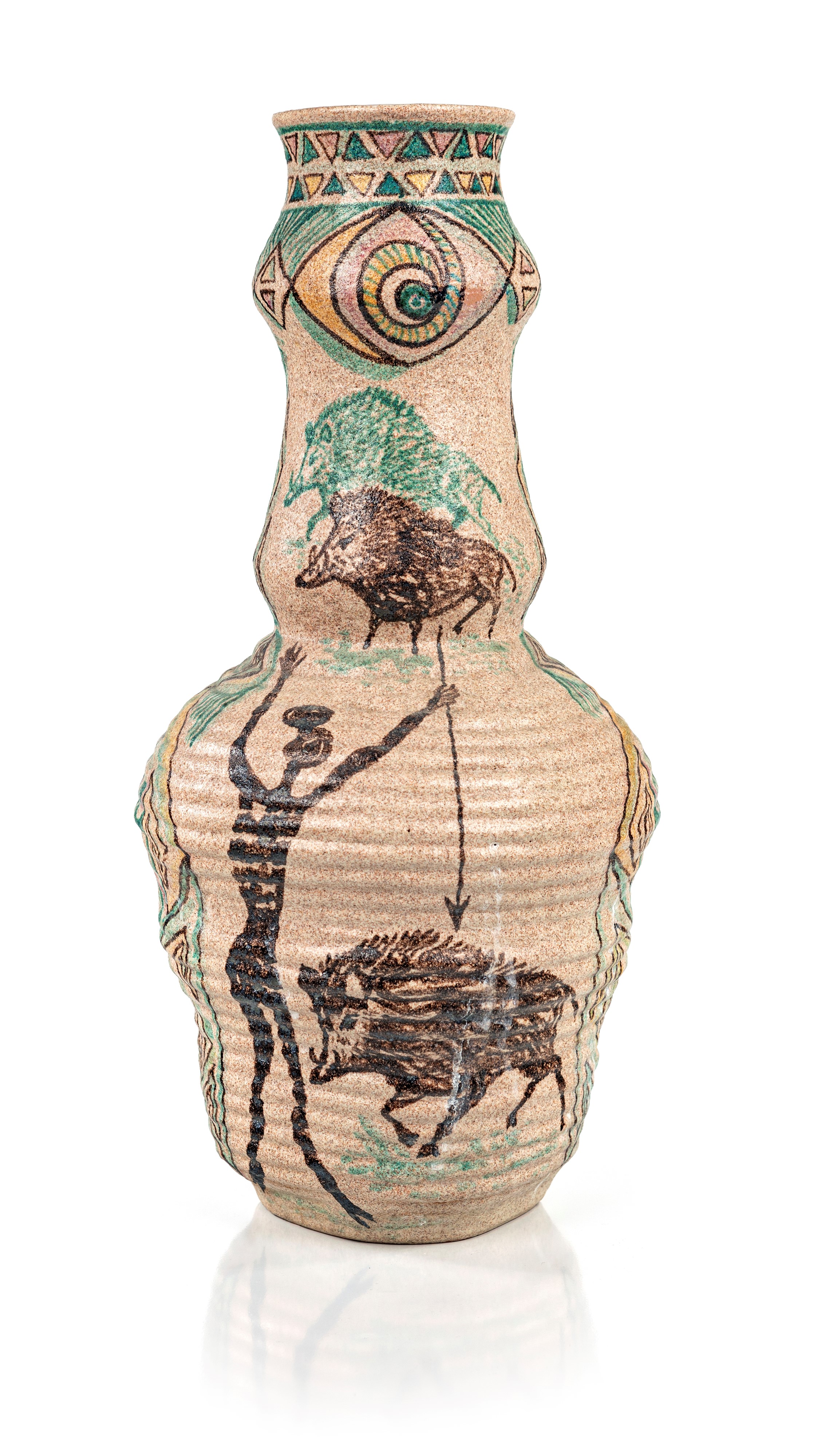 Vaso in ceramica decorata con scene di caccia e motivi geometrici
