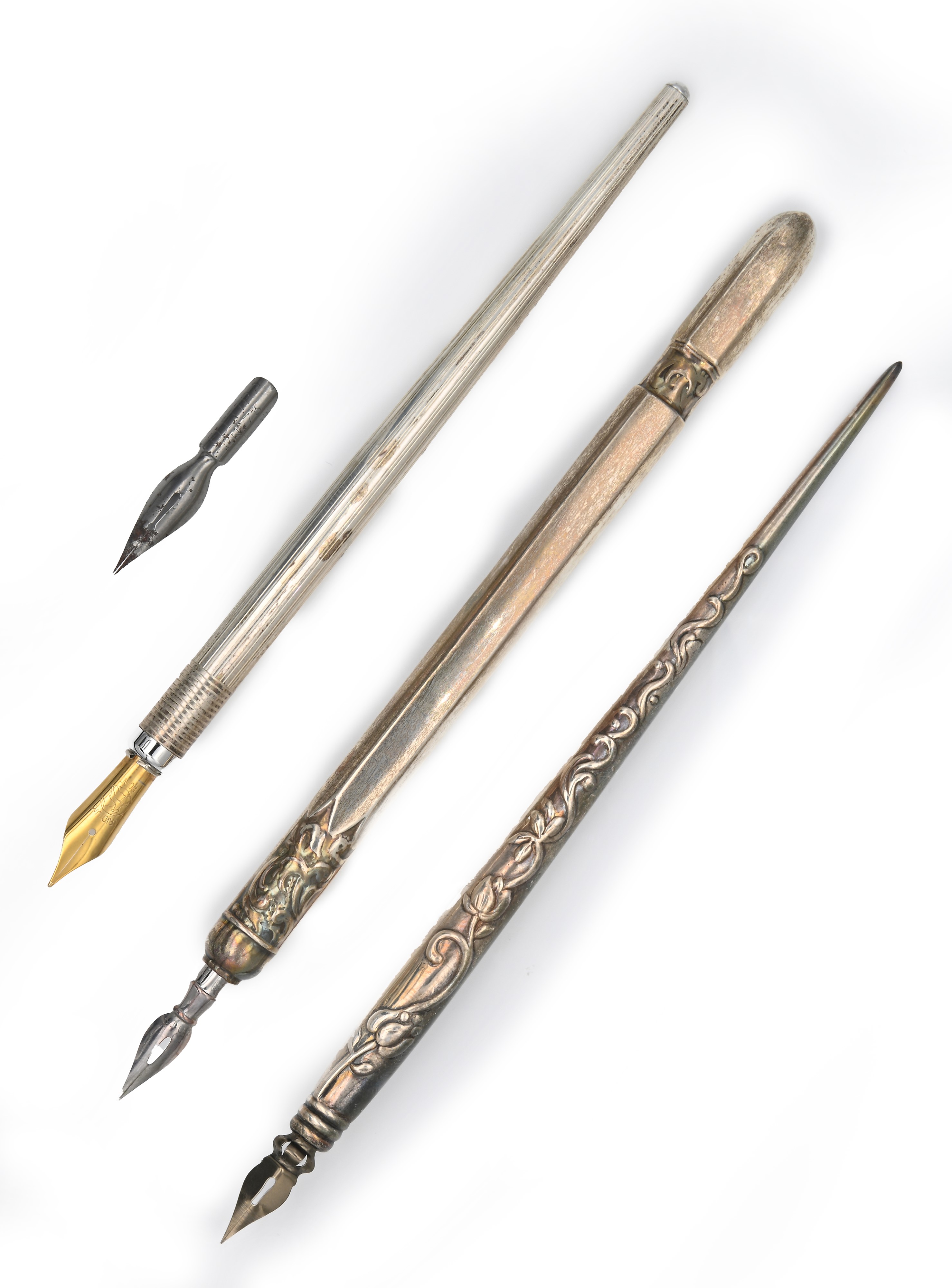 3 penne in argento inciso e sbalzato, una 925/000, una 800/000 e un'altra in argento sterling Londra