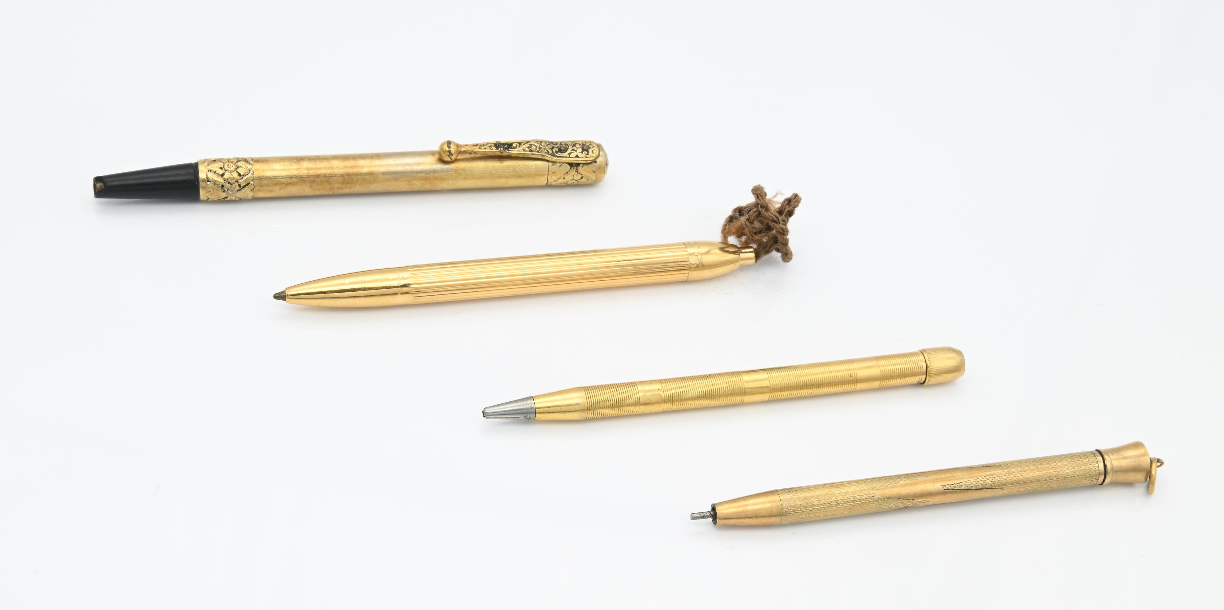 3 Portamine vintage in metallo laminato in oro giallo 18 Kt e una piccola penna da borsetta Waterman in metallo placcato in oro giallo