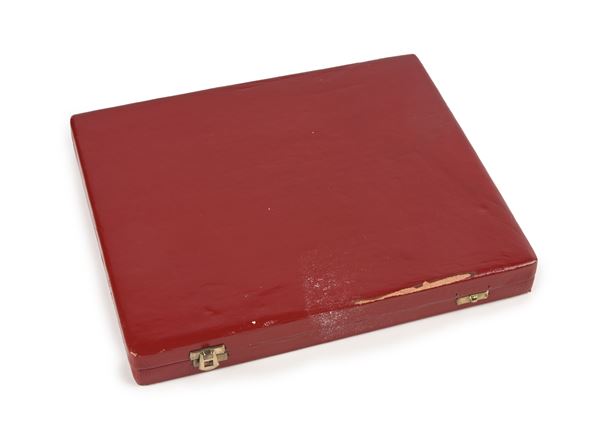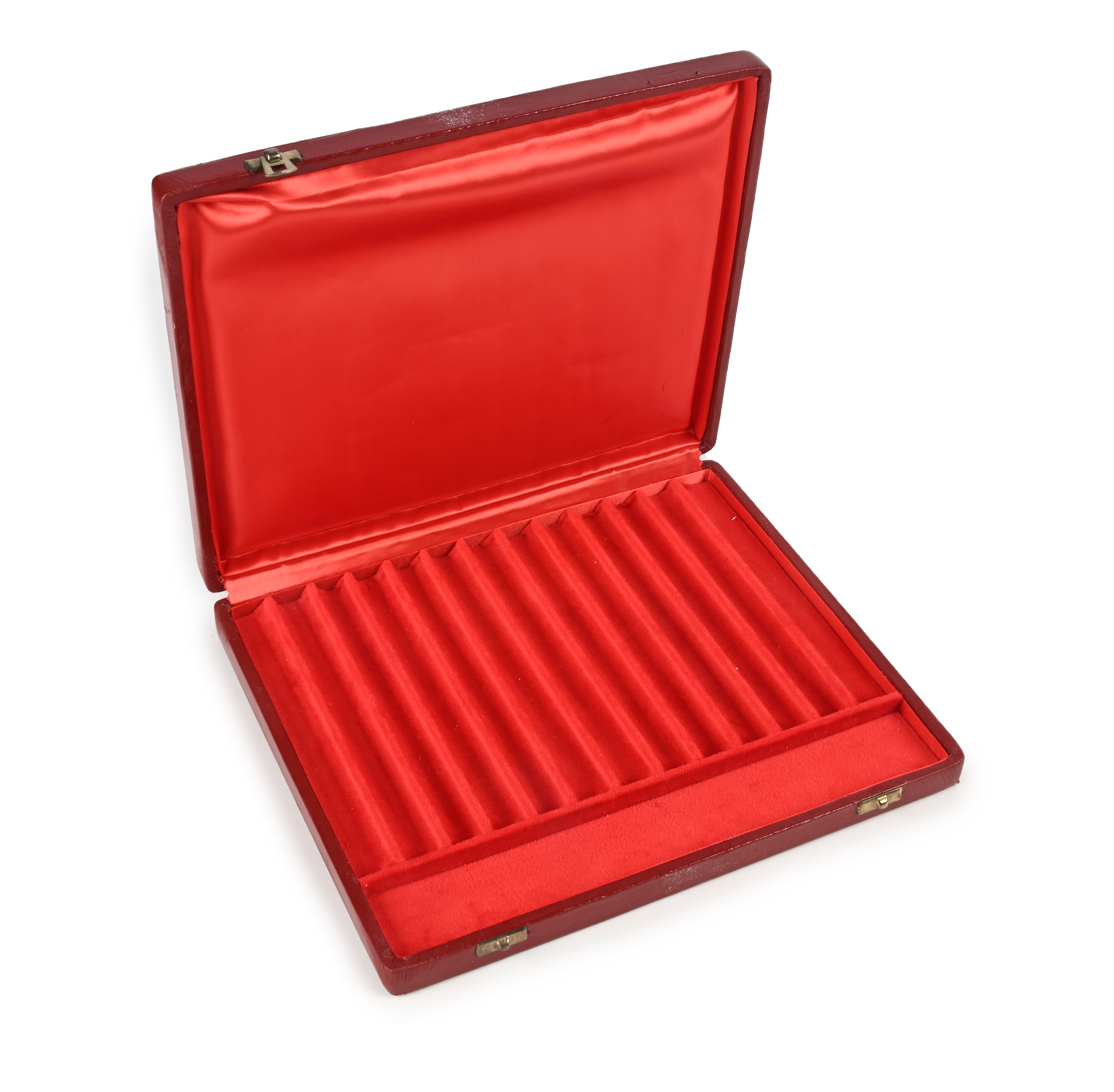 Astuccio portapenne in legno rivestito di pelle rossa. Interno in raso e velluto rosso Con 13 scomparti