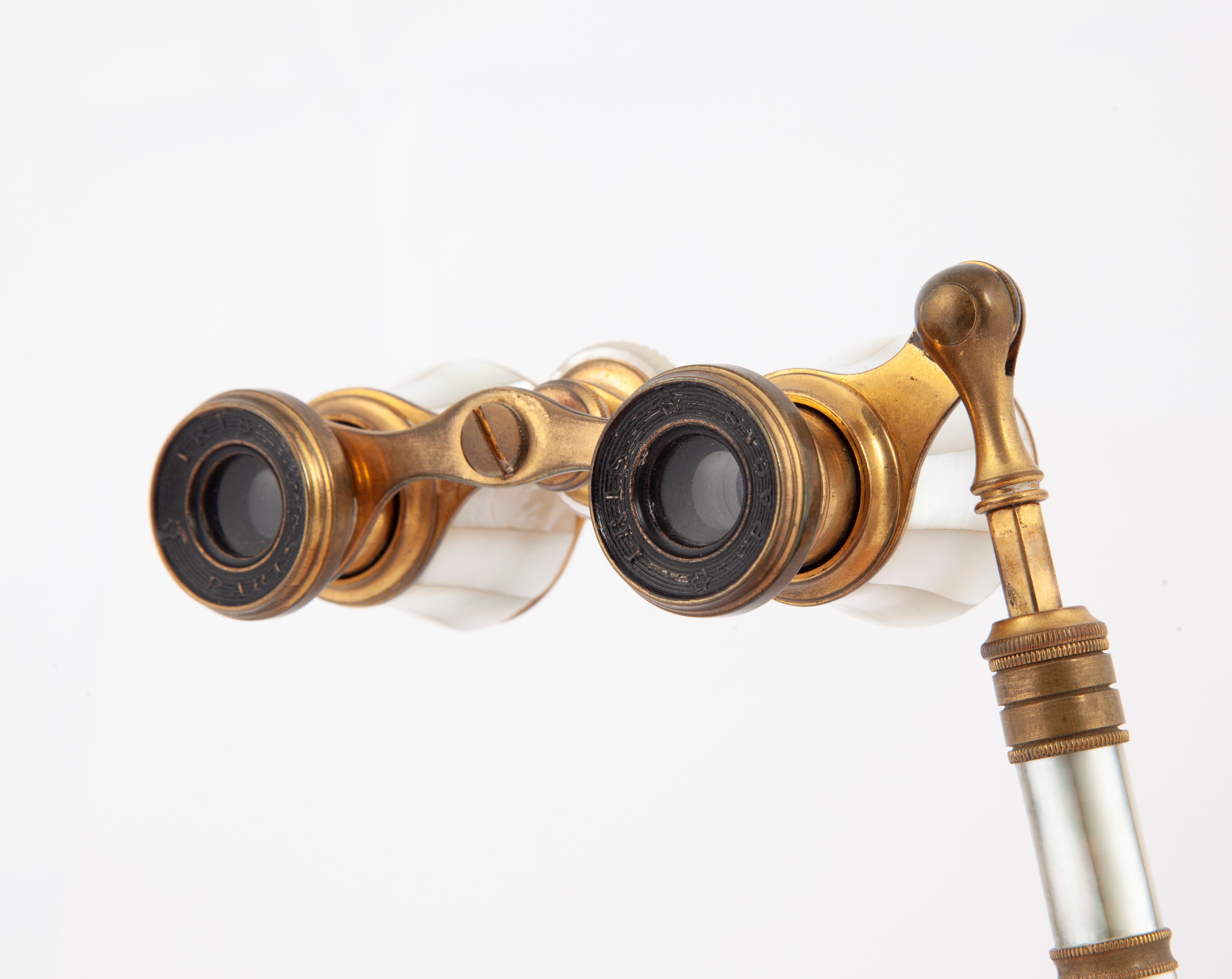 Binocolo da teatro in ottone e madreperla con impugnatura pieghevole. Marcato Iris a Paris, Francia fine XIX secolo