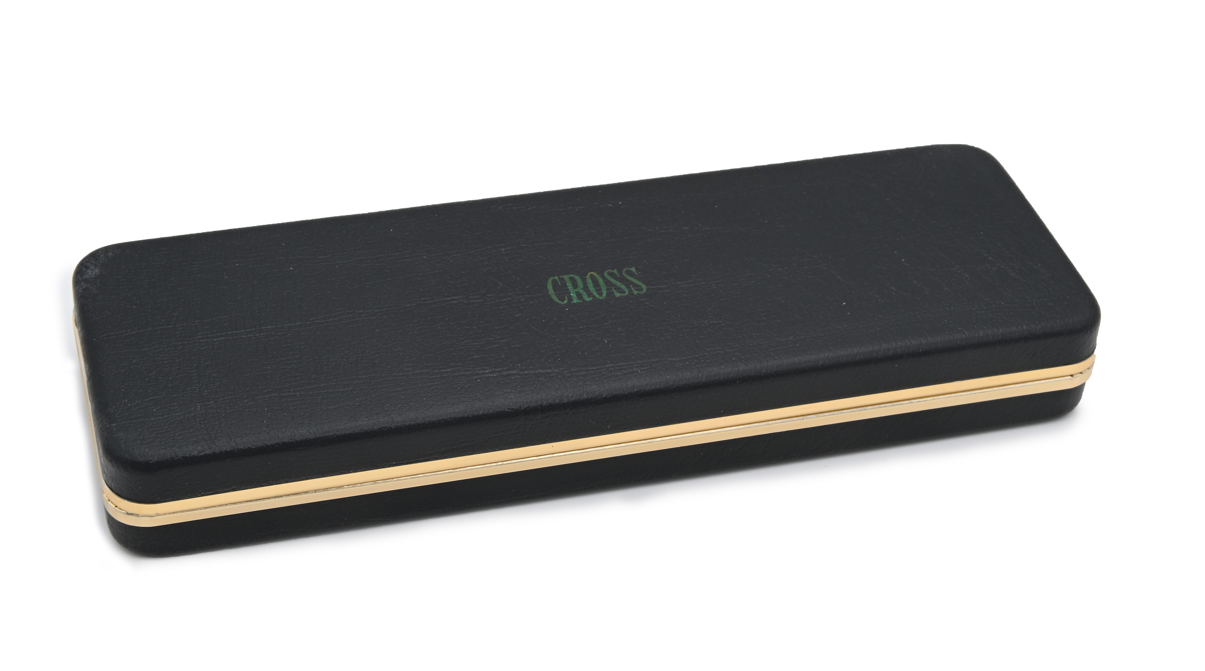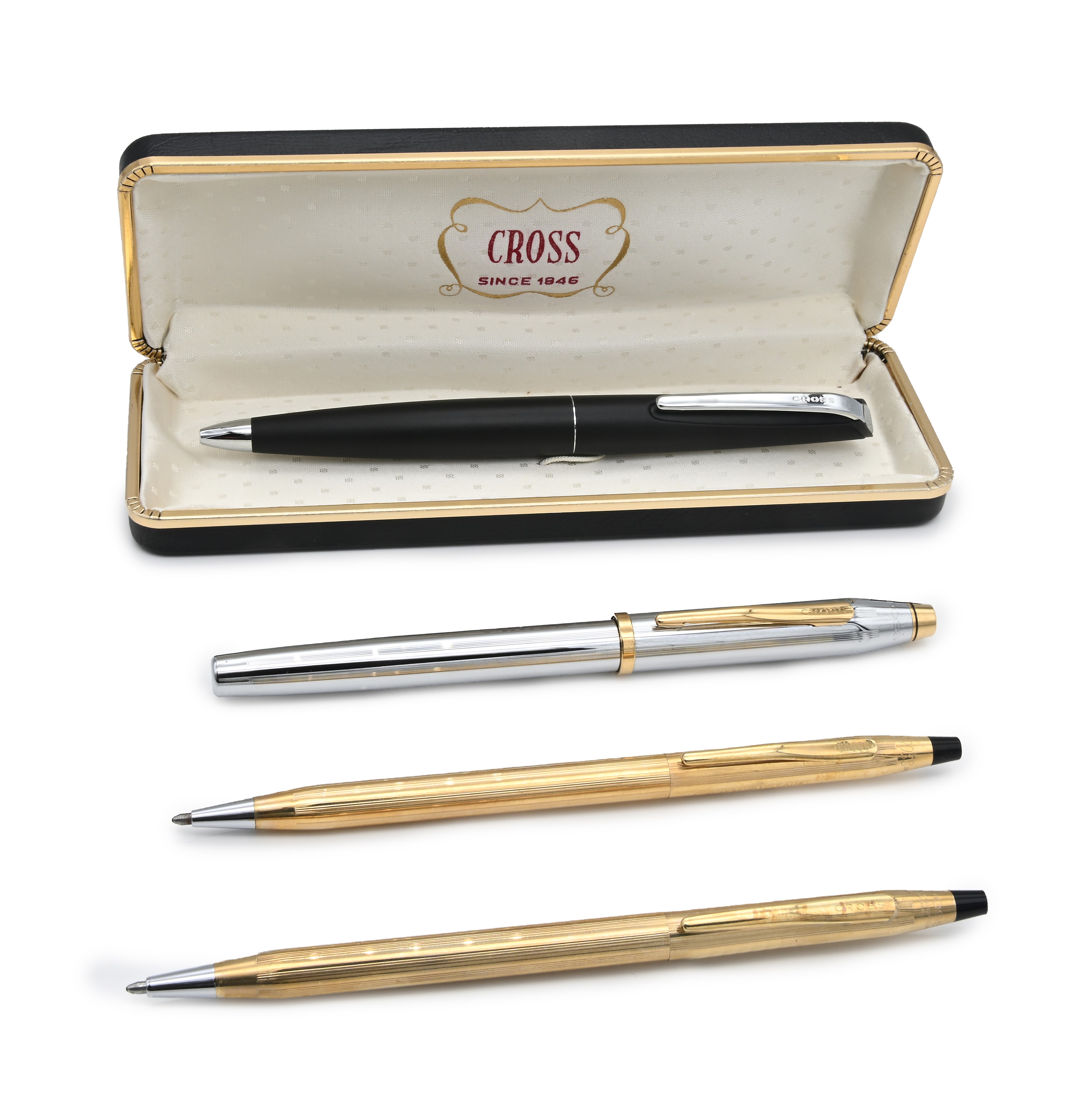 Cross - 2 penne a sfera in metallo placcato in oro giallo 10 Kt; 1 Roller in acciaio con particolari dorati; 1 penna a sfera in resina con particolari in acciaio