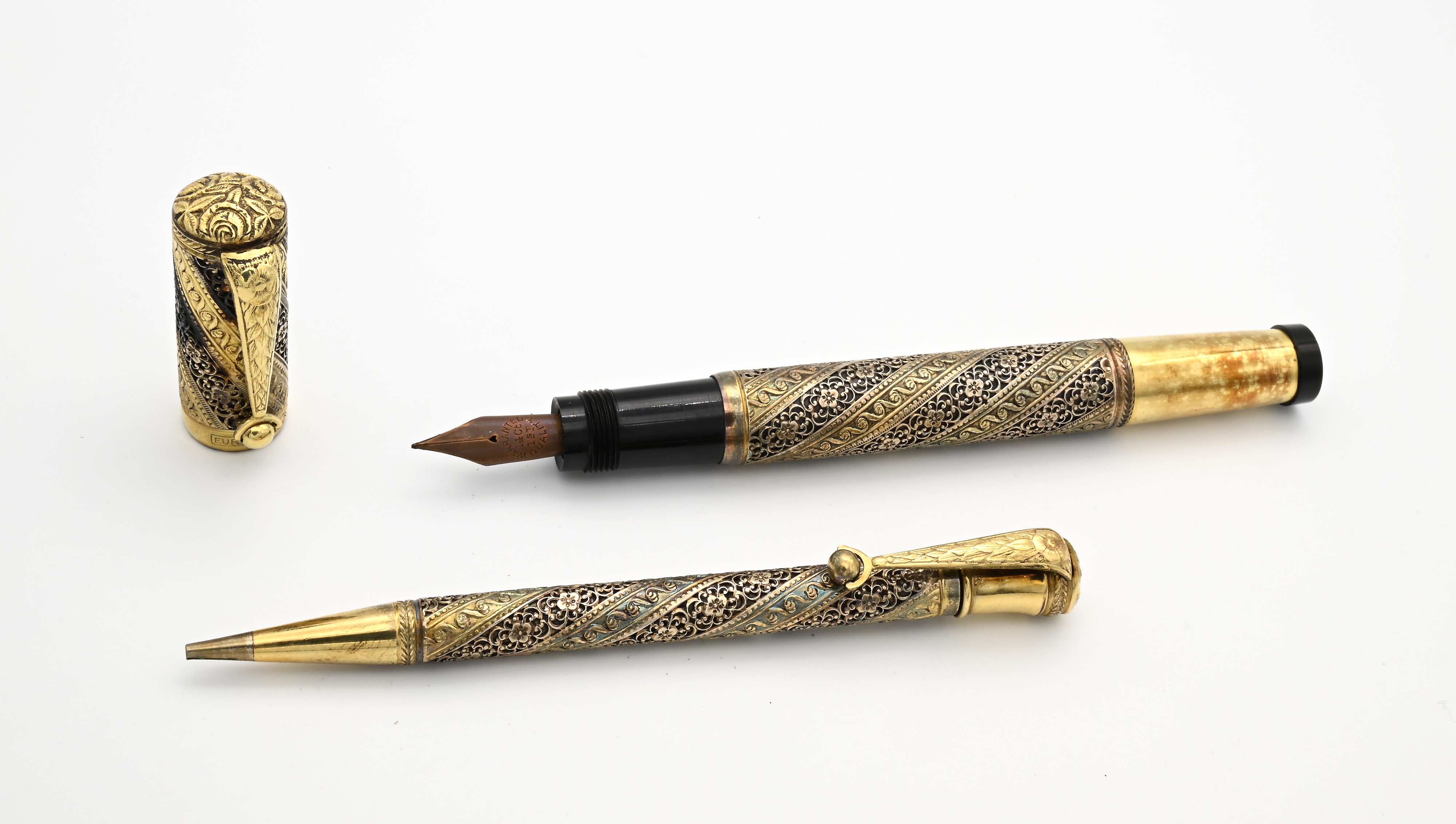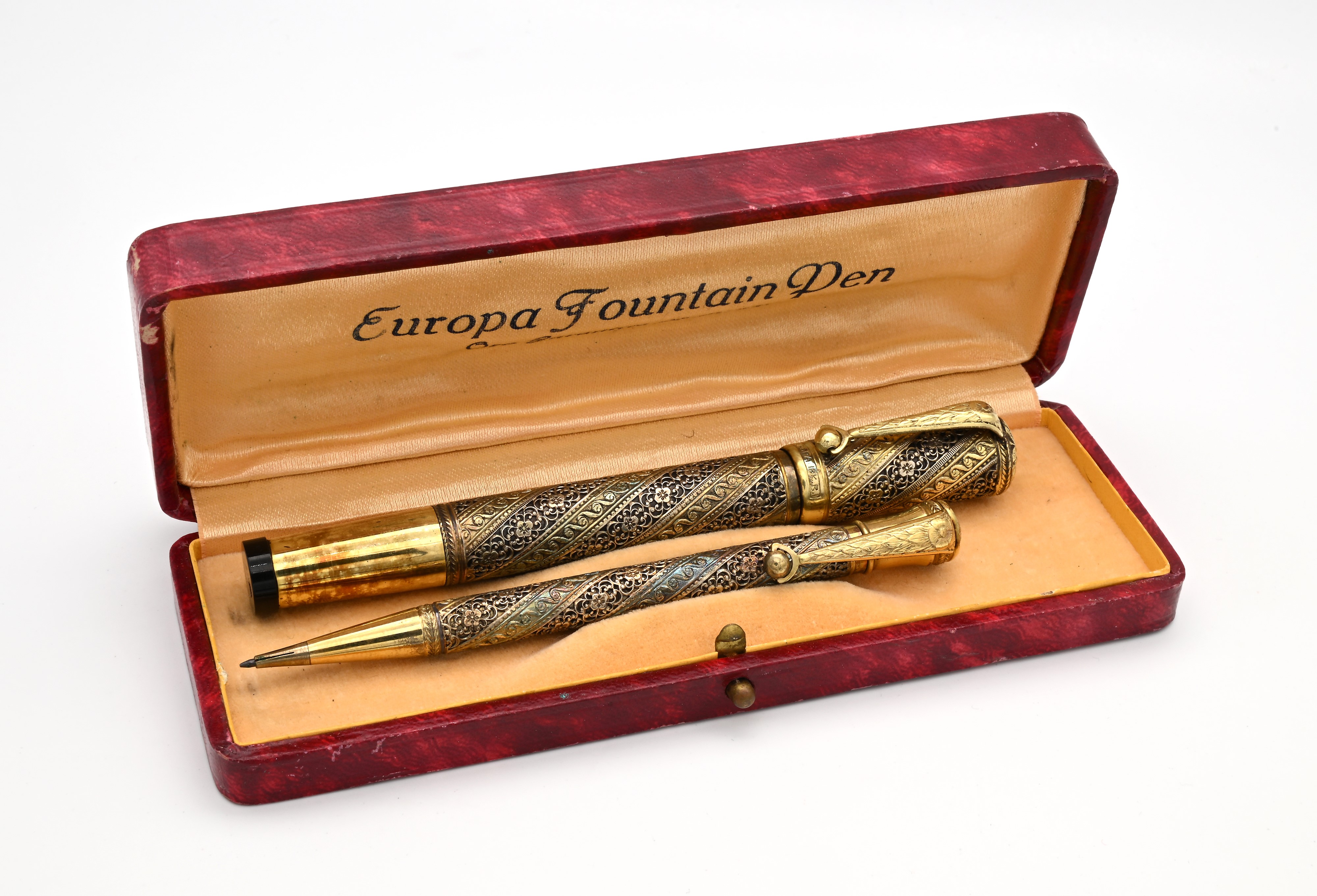 Europa - Penna stilografica retrattile e Portamine vintage in metallo laminato in oro giallo 18 Kt traforato, inciso e sbalzato con motivi geometrici e floreali, anni '20/'30