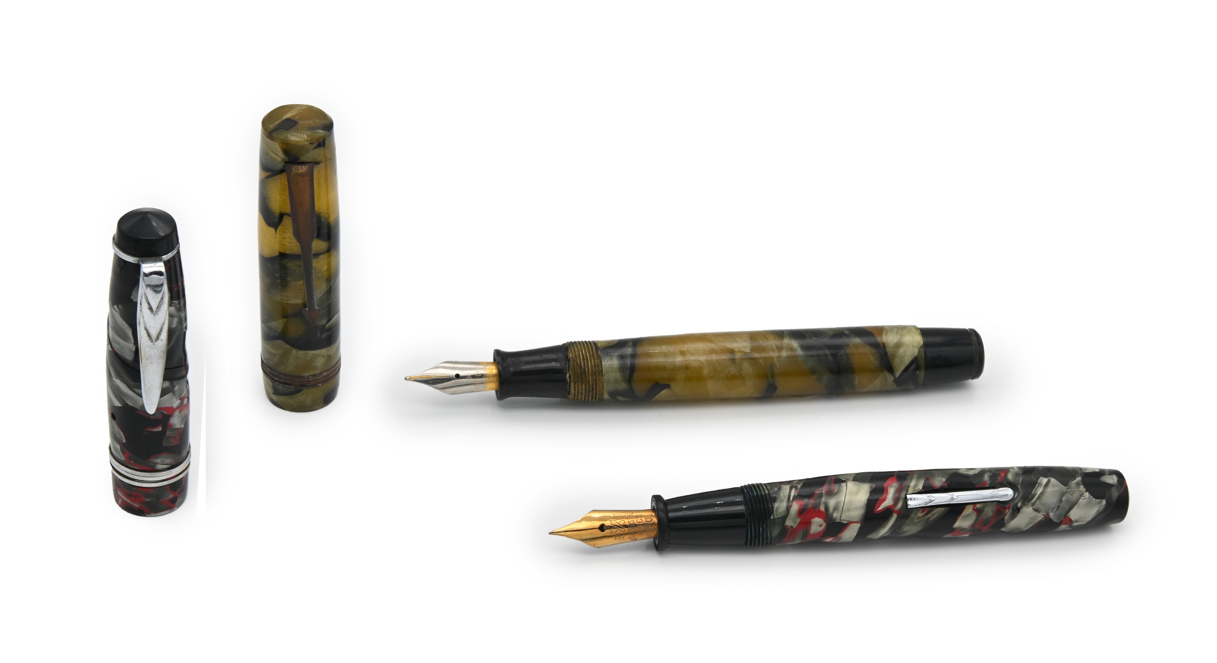 Excelsior Bayard e Reform - 2 Penne stilografiche in celluloide marmorizzata con particolari in metallo (difetti e rotture), anni '30/'40