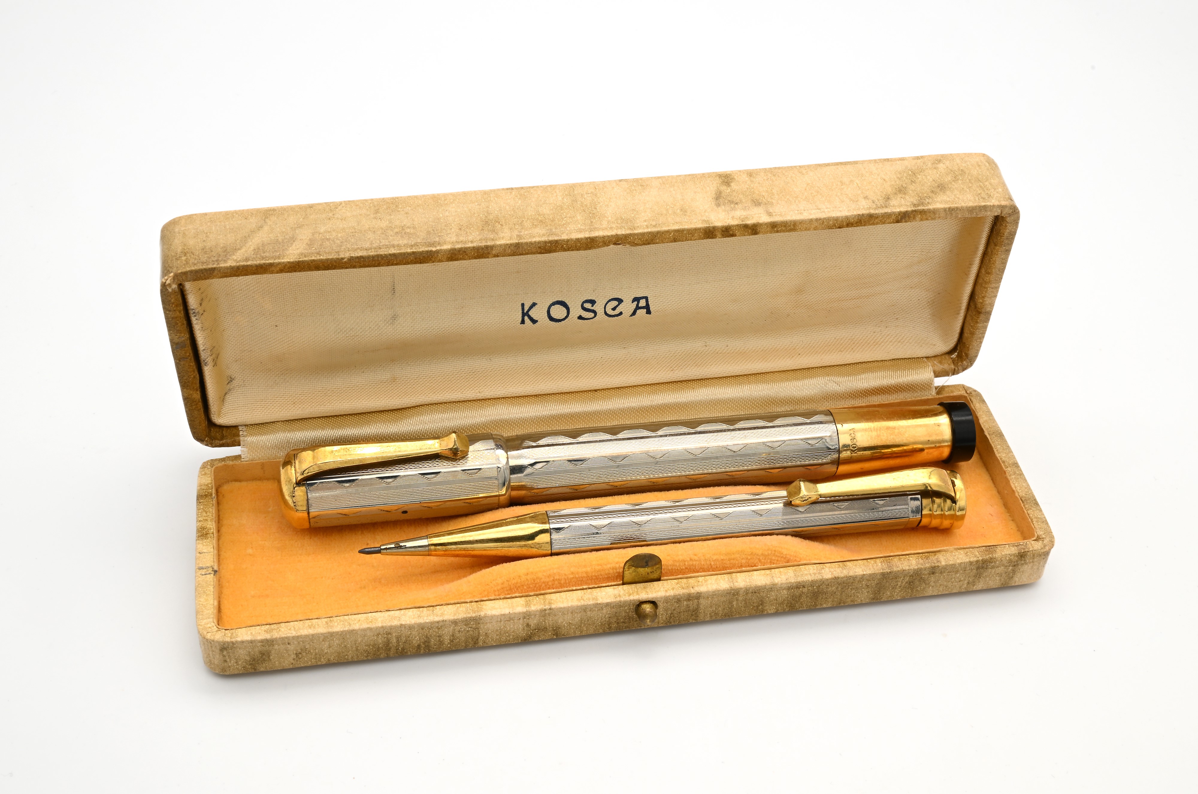 Kosca - Penna stilografica retrattile e Portamine vintage in metallo e metallo laminato in oro giallo con incisioni geometriche, anni '30