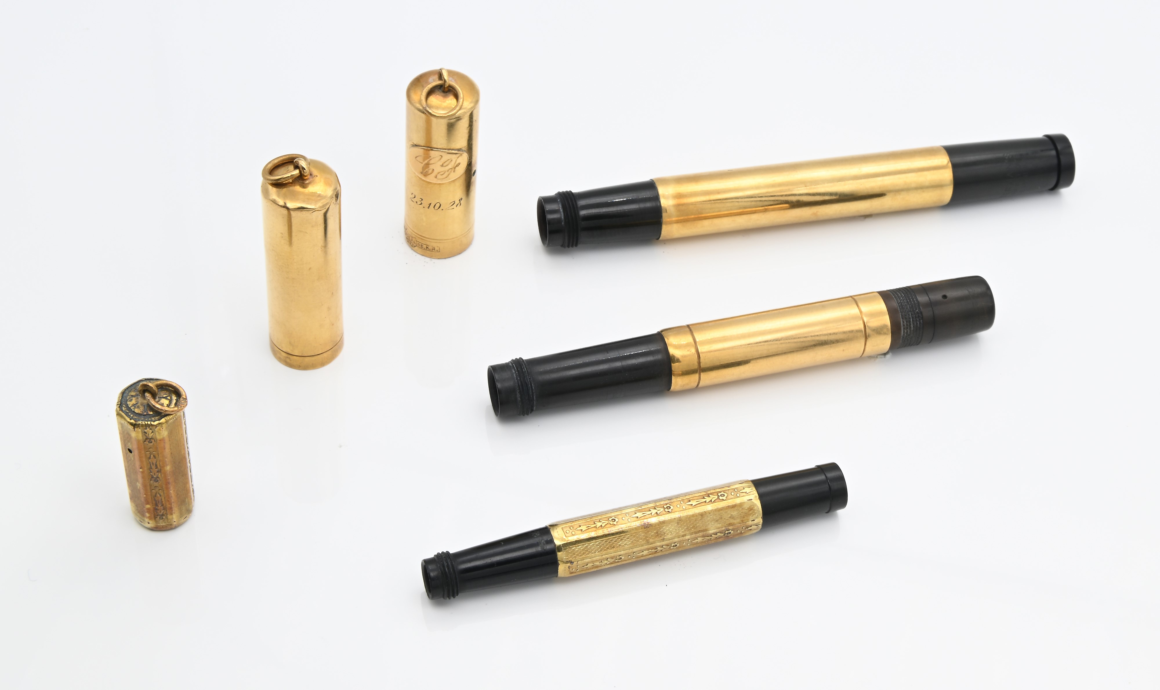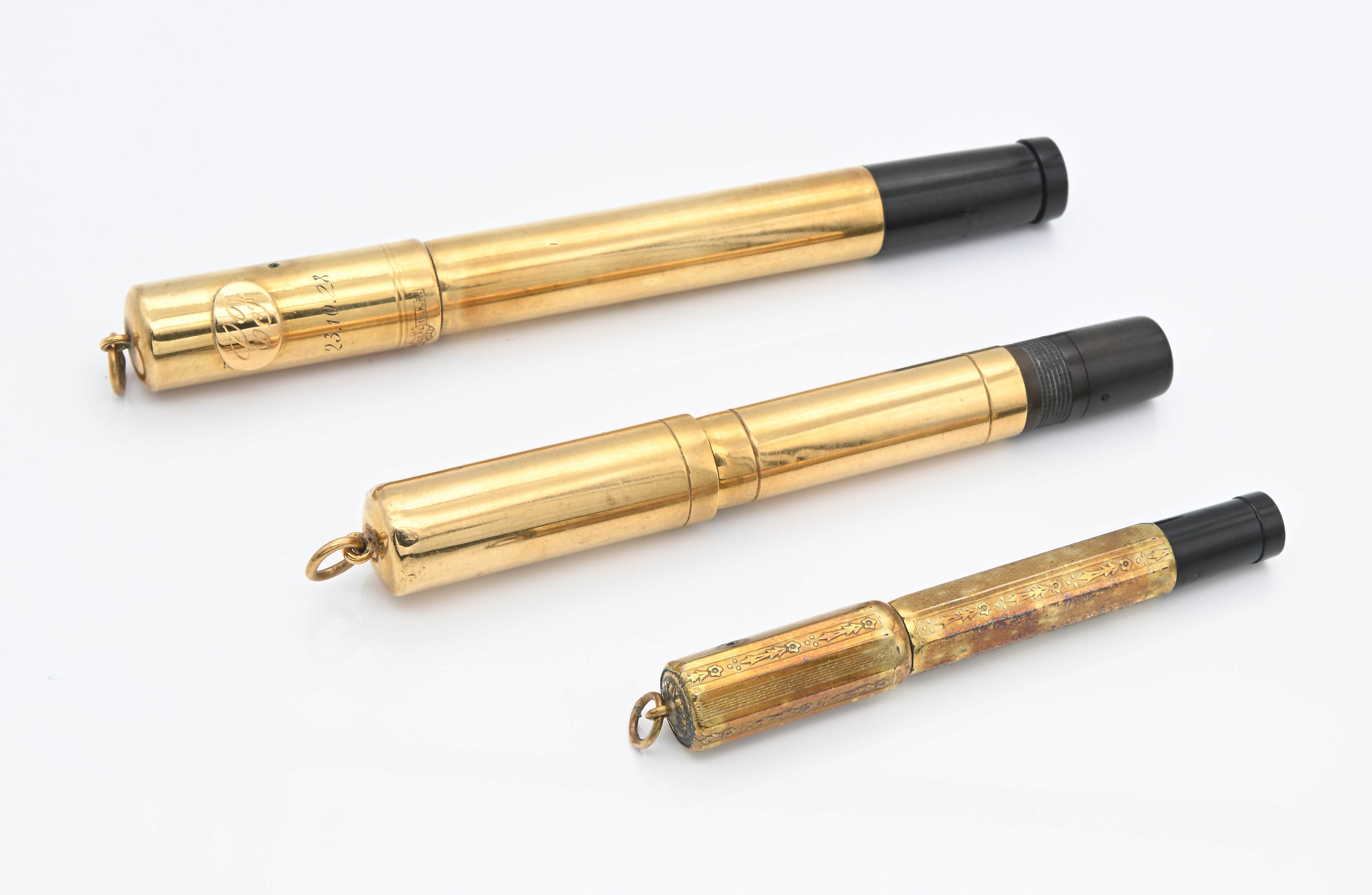 Lotto di 3 penne stilografiche vintage in metallo laminato in oro giallo 18 Kt (1 Waterman Ideal datata 23.10.28), anni '20/30