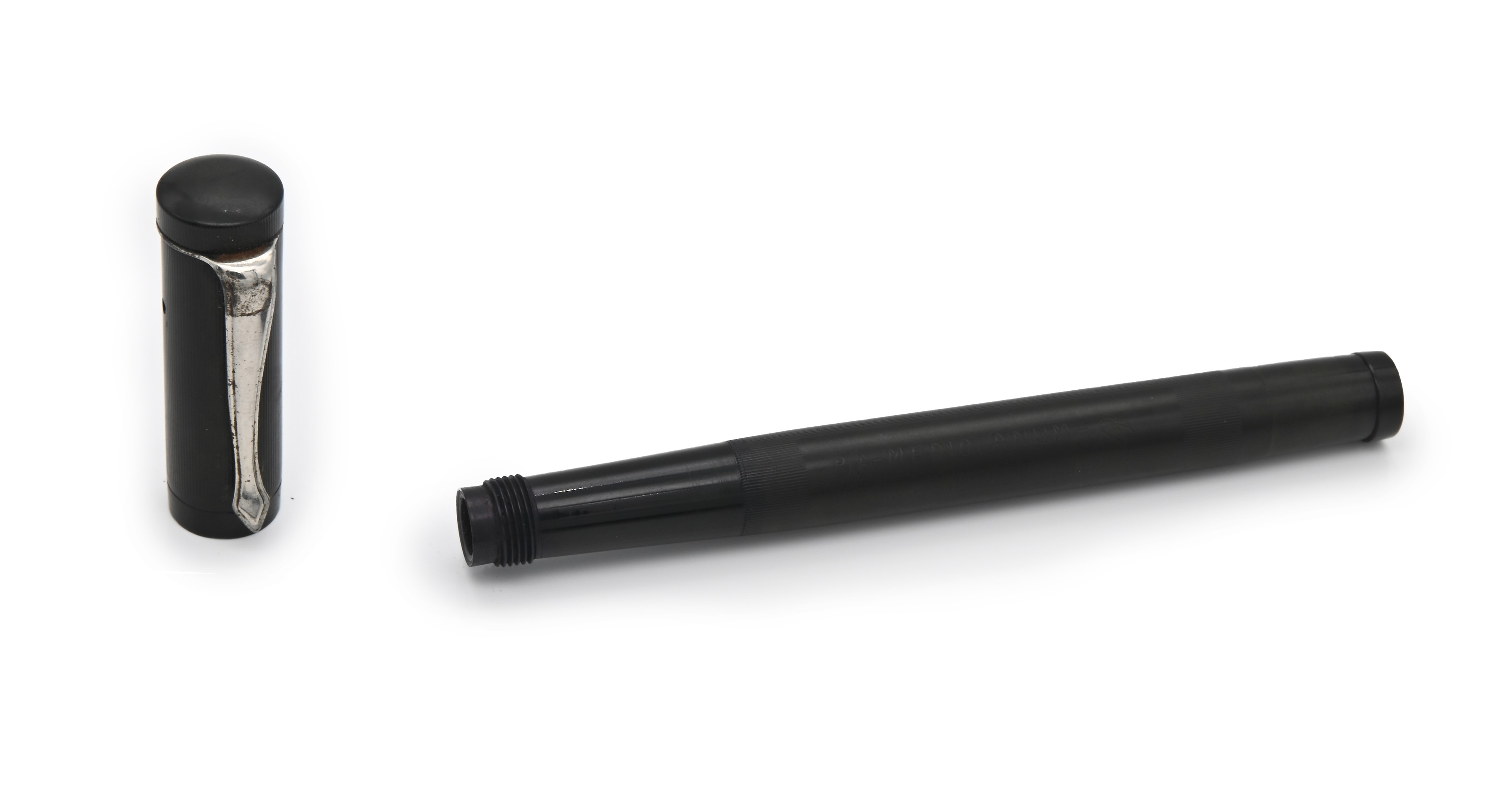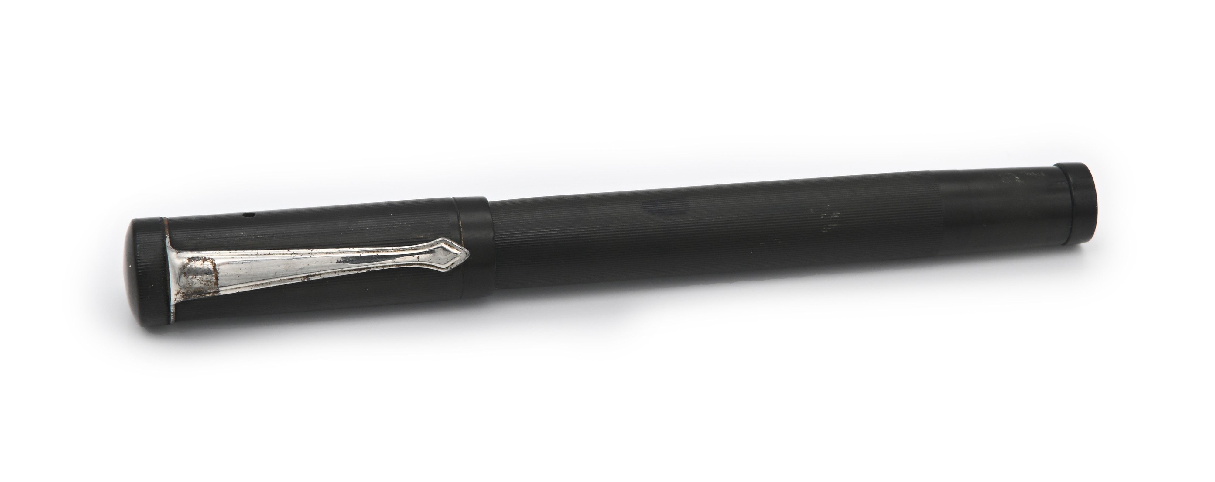Mediolanum - Penna a serbatoio italiana in ebanite con particolari in metallo cromato Pennino in vetro