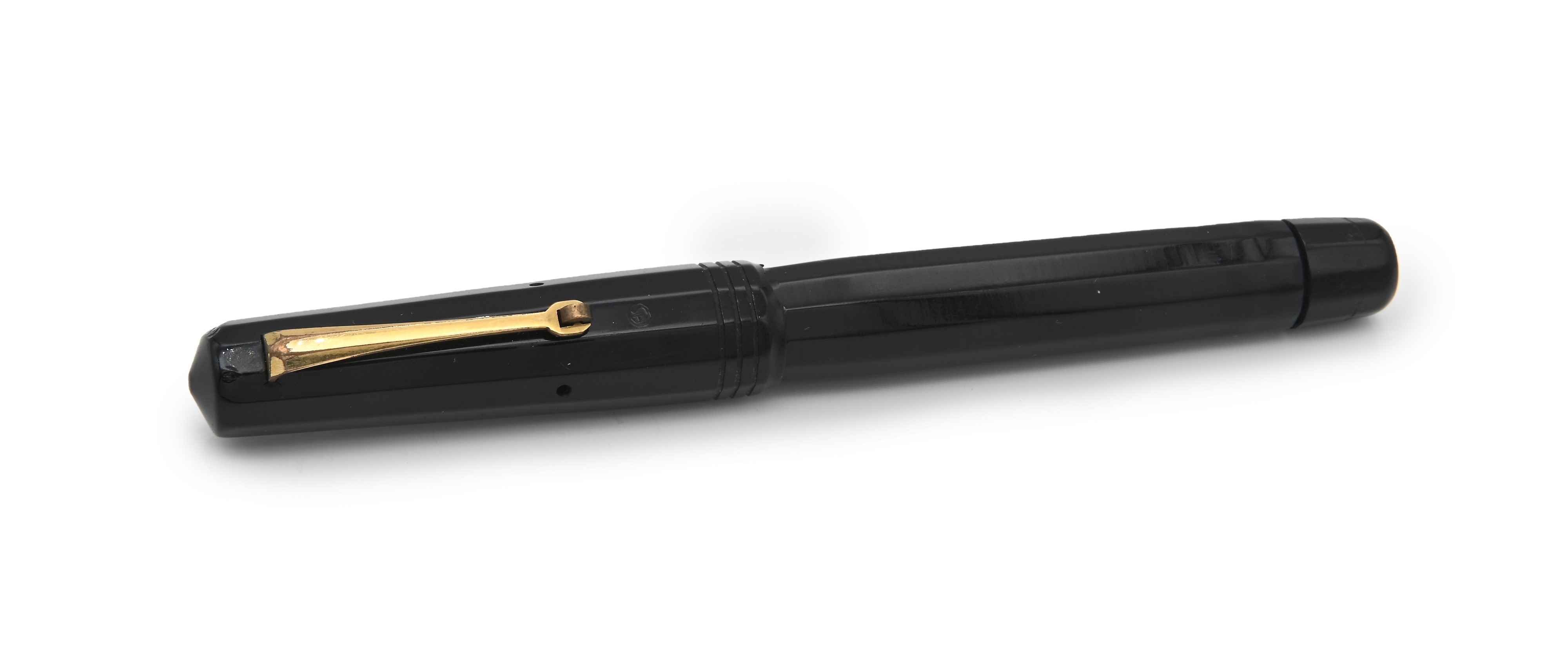 Omas Extra Lucens - Penna stilografica sfaccettata vintage in celluloide nera con particolari dorati. Brev. 73725-1936, 1936