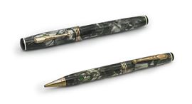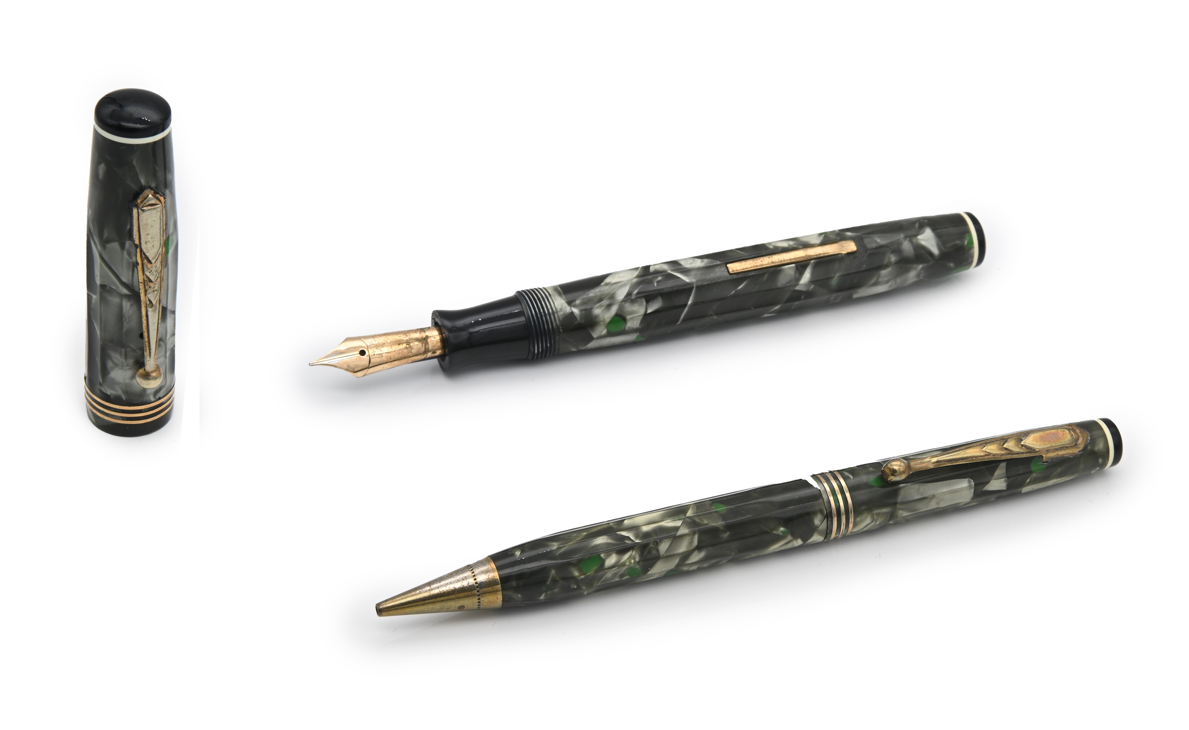 Parker Parkette Deluxe - Penna stilografica e Portamine vintage in celluloide marmorizzata con particolari in metallo dorato, anni '30
