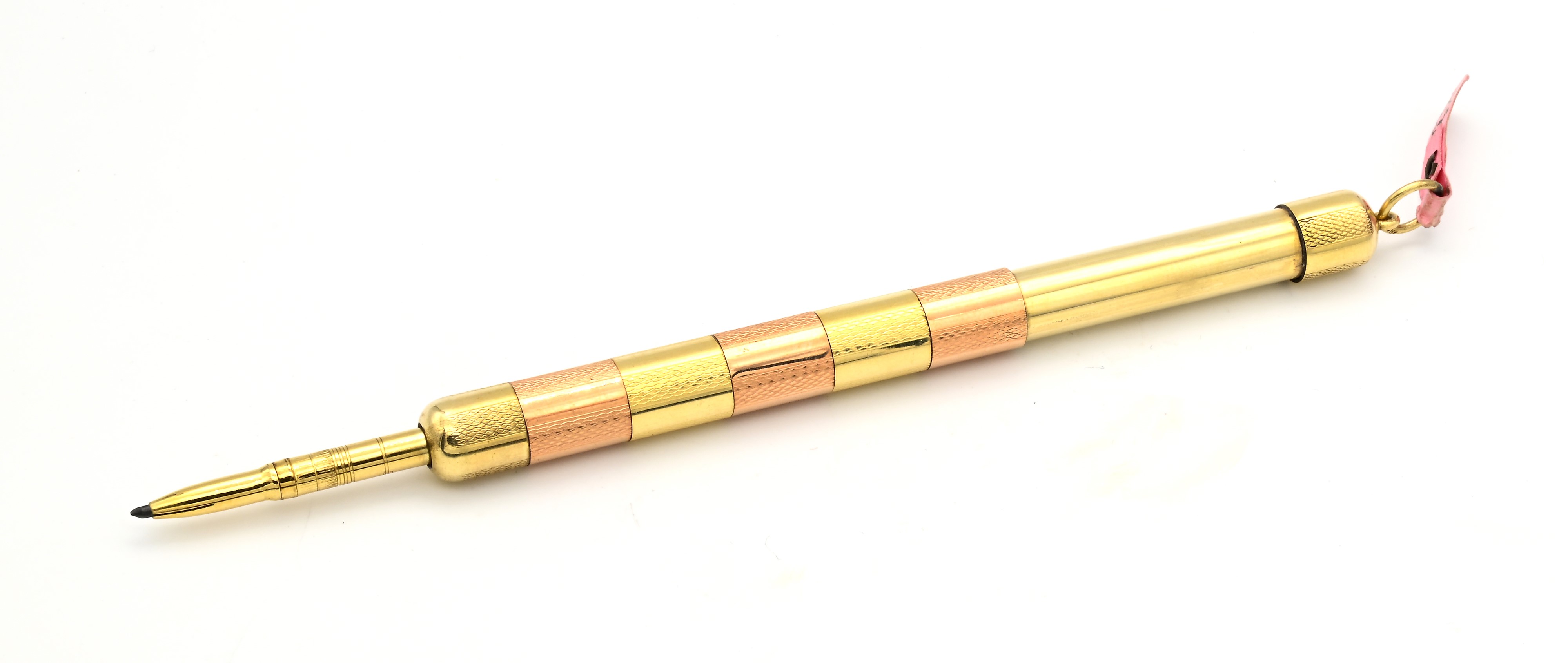 Portamine telescopico vintage in metallo placcato oro giallo e rosa con incisioni geometriche