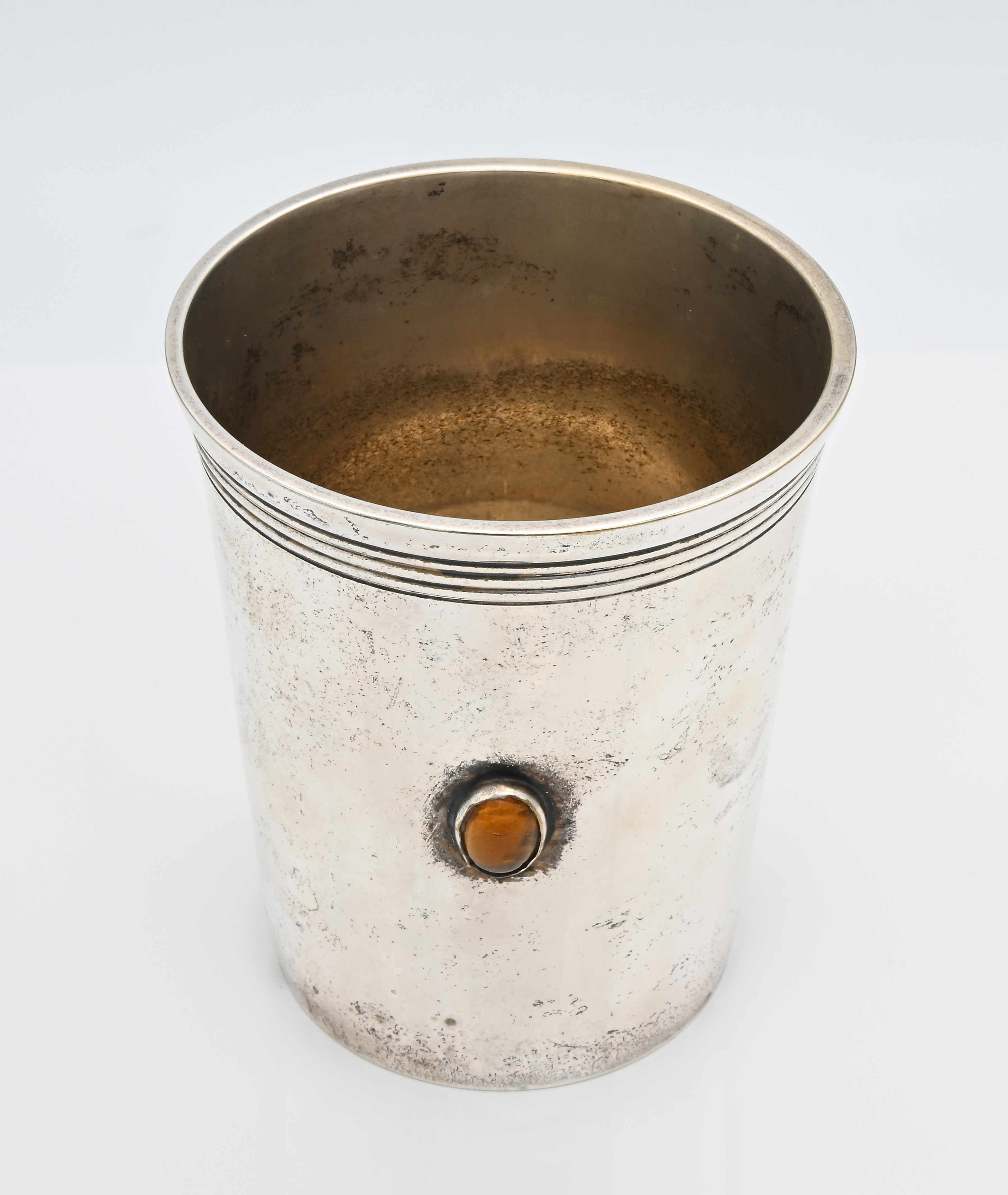 Portapenne in metallo argentato con 3 gemme cabochon (ambra?) incastonate