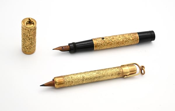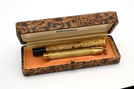 Record - Penna stilografica retrattile e Portamatita vintage in metallo laminato in oro giallo con sbalzo ed incisioni floreali, anni '20