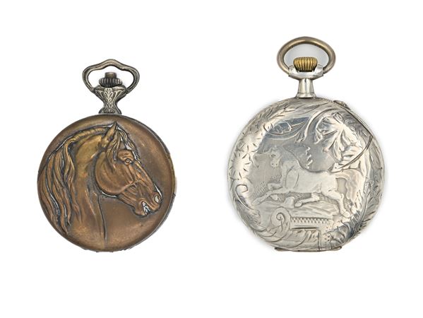Funzionante. Thermidor - Orologio da tasca a savonette remontoir da uomo in metallo con incise raffigurazioni di cavalli con meccanica probabilmente non pertinente. Diam mm 50.