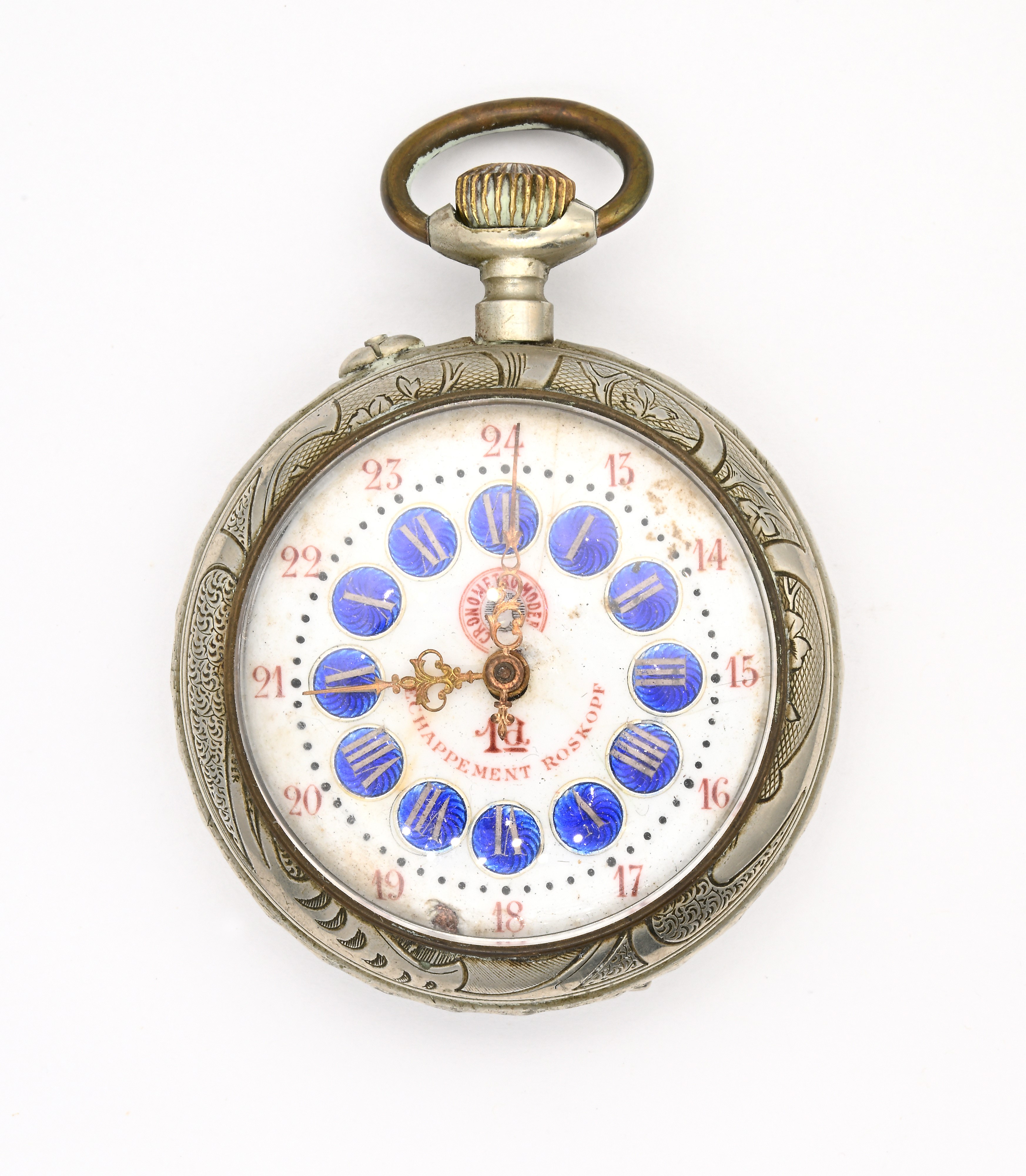 Cronometro moderno - Orologio da tasca da uomo a carica remontoir, con scappamento Roskopf, e cassa incisa in metallo cromato, 1920/30 circa