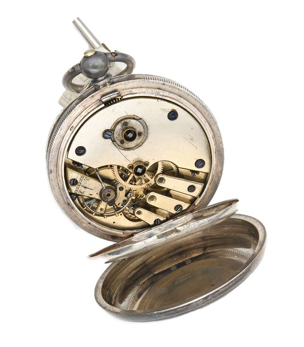 Funzionante. Parapolvere firmato e numerato 66578. Cassa e quadrante numerati 66579. Catena in metallo con chiavetta