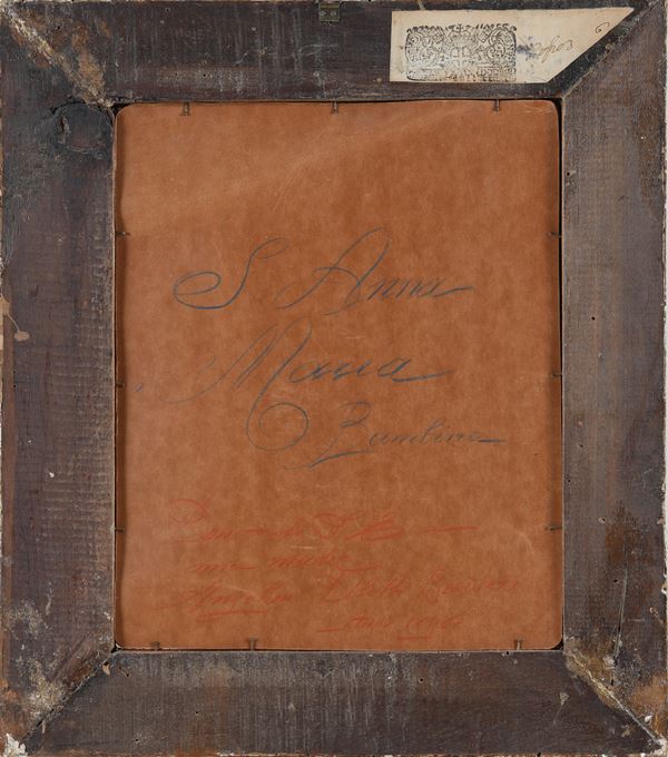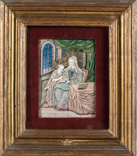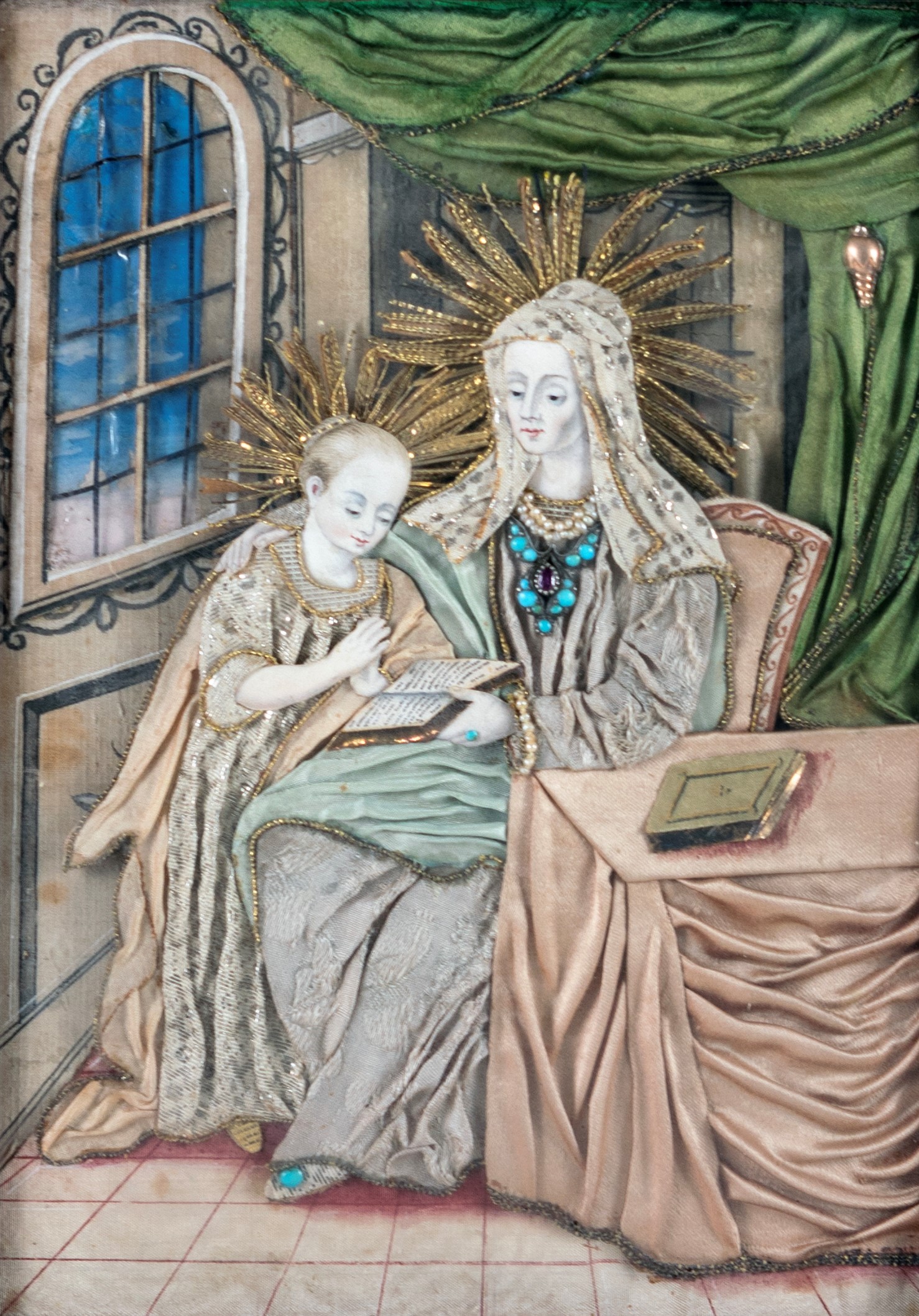 La scena è rappresentata con effetto illusionistico prospettico con figure rese in bassorilievo tramite la tecnica stessa che le compone; l'ambientazione è dipinta; la finestra centinata a sinistra della scena è verosimilmente resa grazie ad inserti trasparenti che simulano la vetrata; la Vergine bambina e Sant'Anna recano aureole realizzate con sottili fili dorati lisci alternati ad altri intrecciati; la figura di Sant'Anna è adornata da piccole perline e gemme turchesi. Cornice modanata in legno dorato; al verso, sul telaio, etichetta cartacea con stemma del Regno d'Italia con croce sabauda. La peculiarità di quest'opera non risiede tanto nel valore iconografico dei personaggi quanto nella tecnica insolita a collage con cui sono stati rappresentati gli abiti e gli apparati scenici; eseguito con molta probabilità tra la fine del Settecento e gli inizi del secolo successivo, questo quadretto mostra delle tendenze verso uno stile più eclettico che avrebbe anticipato circa di un secolo quello che fu definito con il termine "kitch"