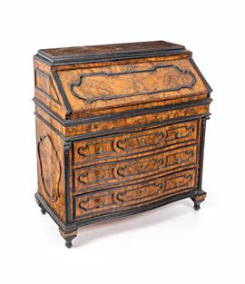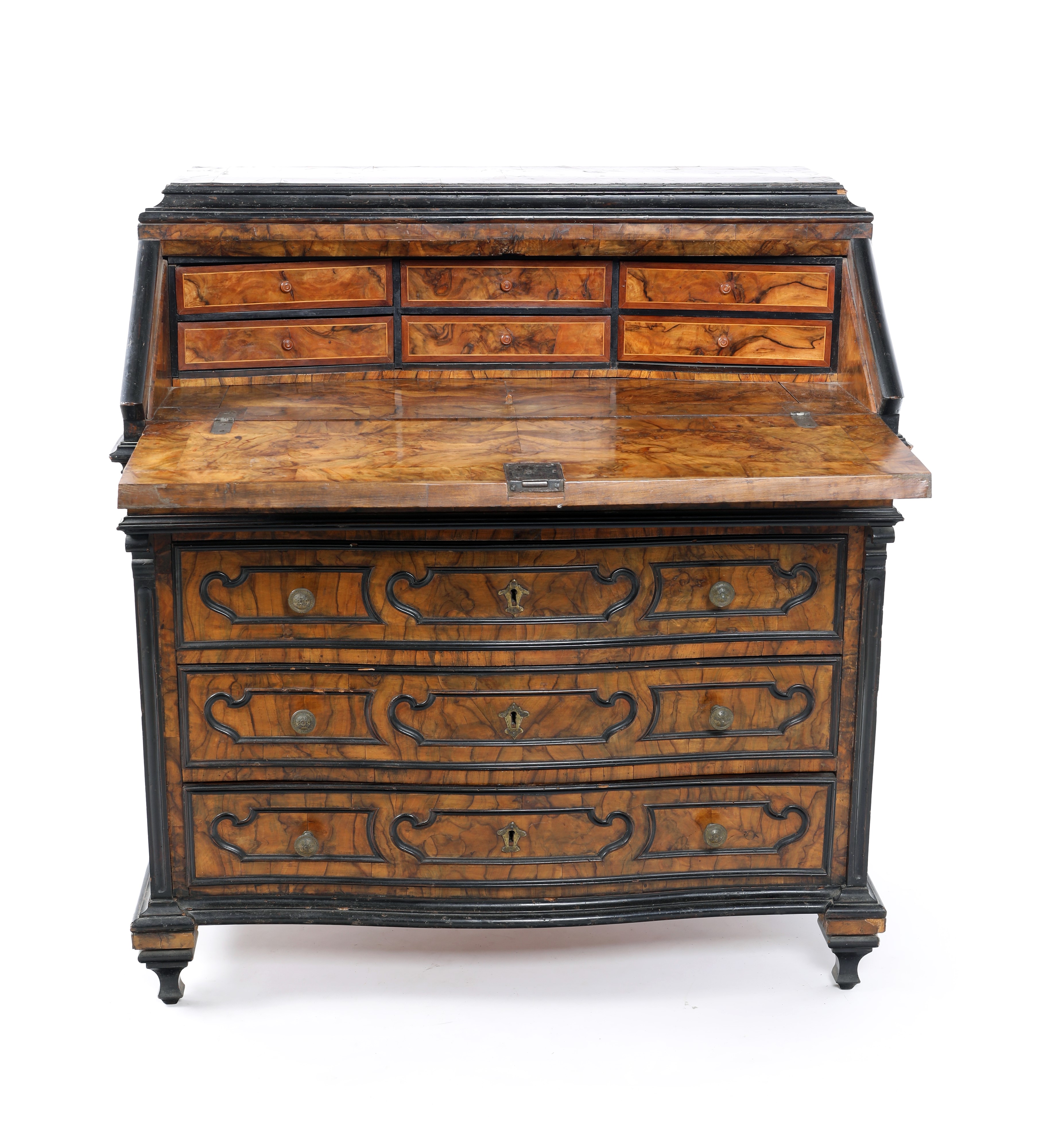 con cornici sagomate ed ebanizzate disposte a creare riserve sagomate; la ribalta ospita sei cassetti ed un ripiano scorrevole a celare un ampio scomparto interno; tre cassetti frontali delimitati da lesene ebanizzate, piedi a pilastro. Difetti