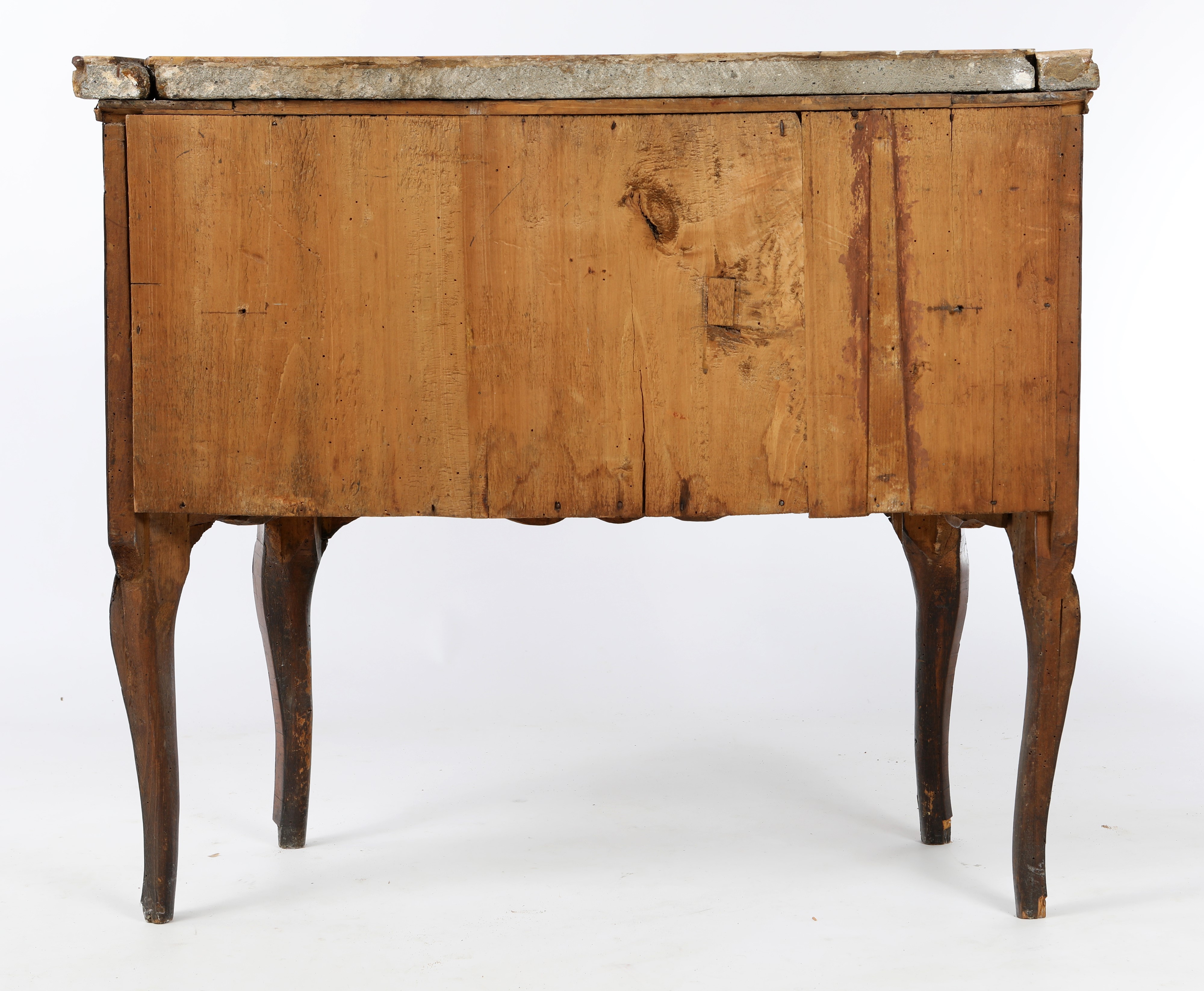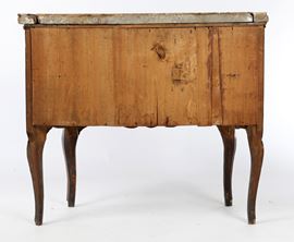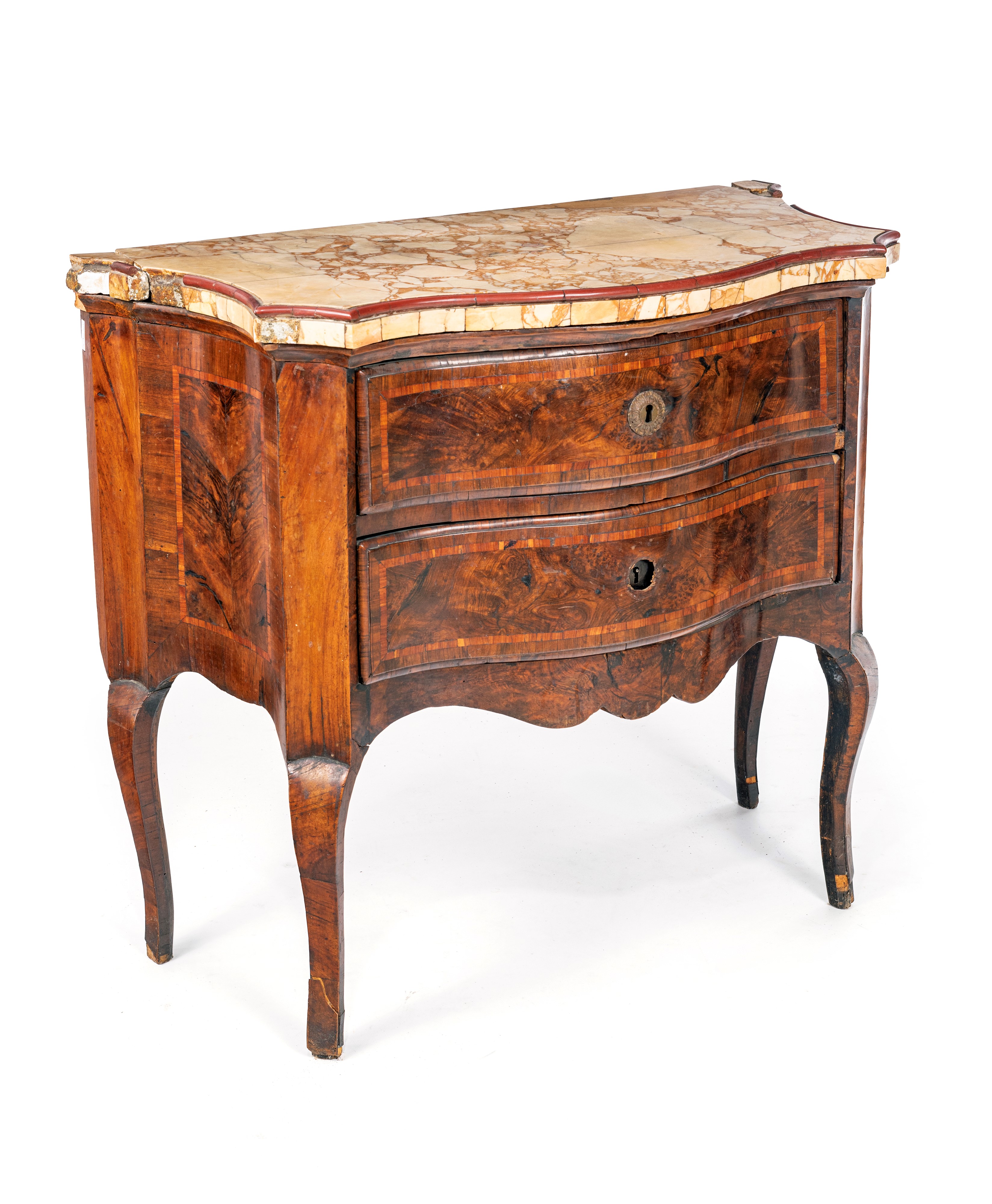 piano in marmo giallo sottolineato da cordolo rosso, due cassetti frontali delimitati da spigoli scantonati, fianchi concavi, grembiale curvilineo, gambe mosse. Difetti al piano (rottura dell'angolo posteriore destro)