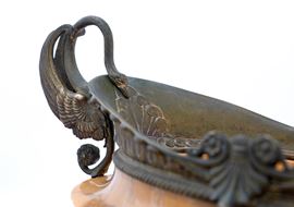 di forma ovale poggiante su rocchio di colonna e piede squadrato; orlo superiore rifinito in bronzo con un unico manico a forma di cigno stilizzato