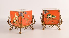 corpo quadrangolare decorato su ogni lato da figure di pappagallo su rami fioriti dipinti in vivace policromia su fondo arancio; struttura in bronzo dorato. Lievi difetti ad un vaso