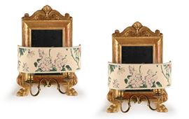 trasformate in appliques a due luci con ventola a fiori; di forma rettangolare sono rifinite superiormente da volute contrapposte centrate da un ventaglio; piedi a zampa caprina