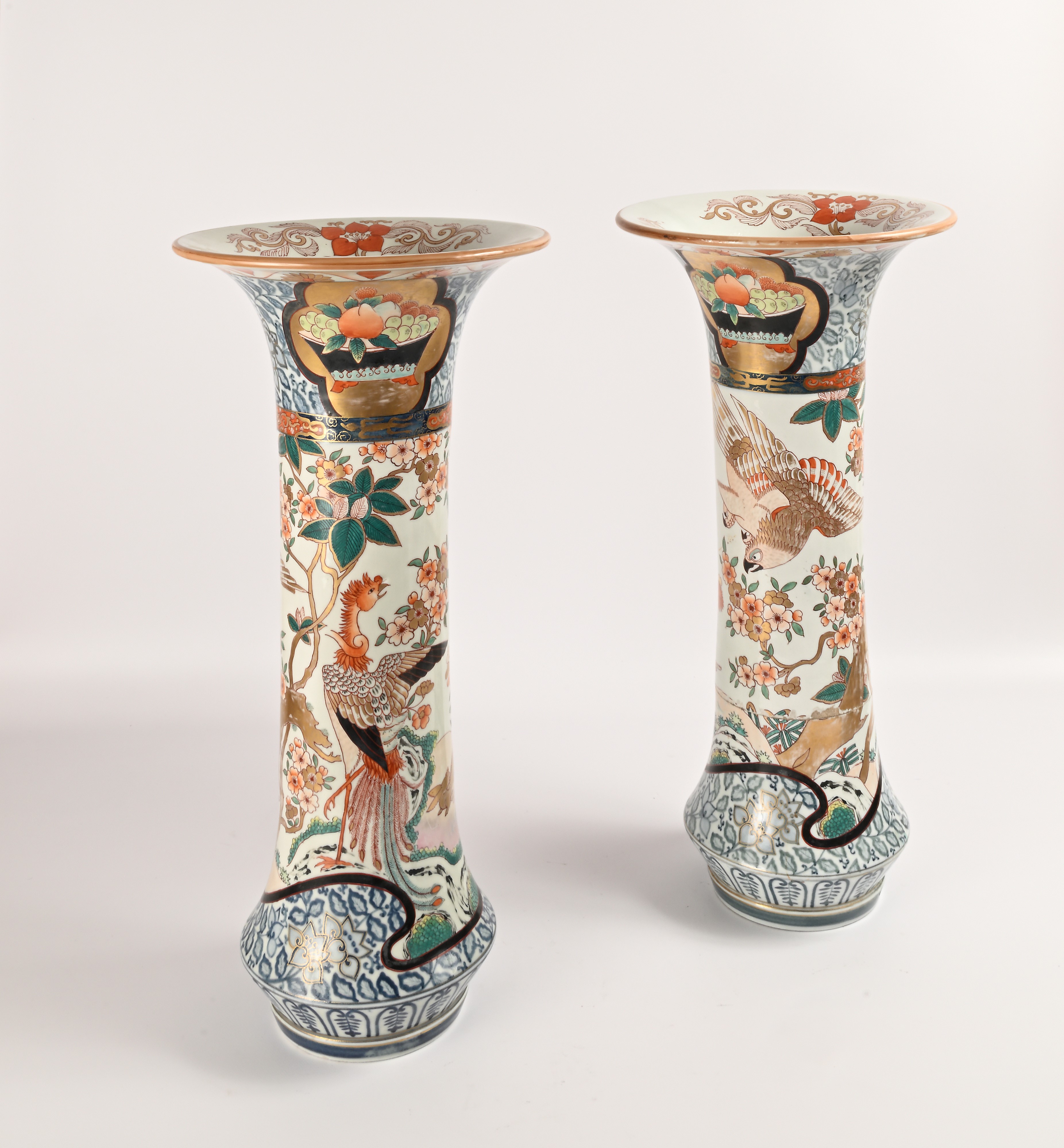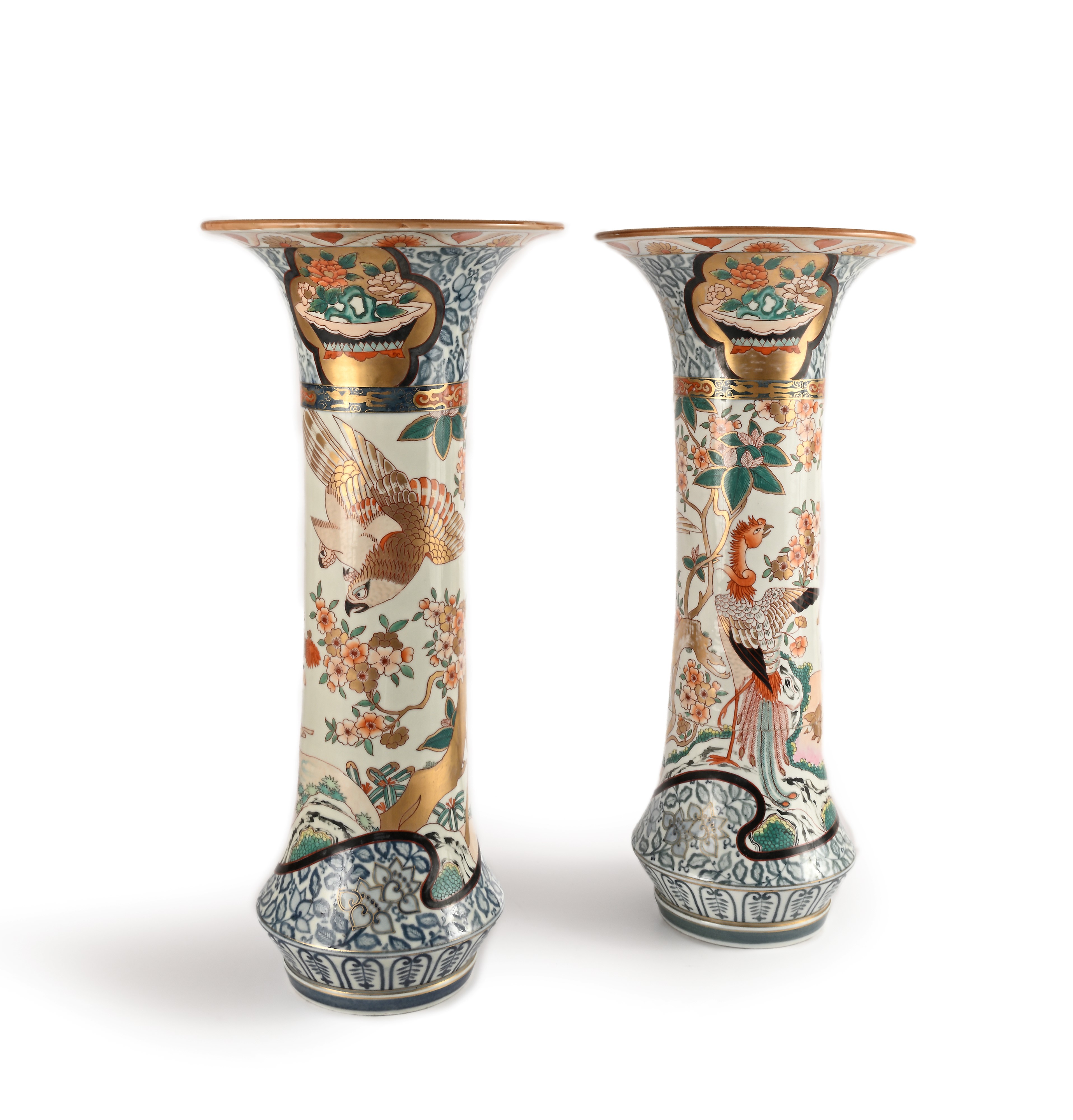 Coppia di grandi vasi a tromba in porcellana policroma, Giappone, XIX secolo