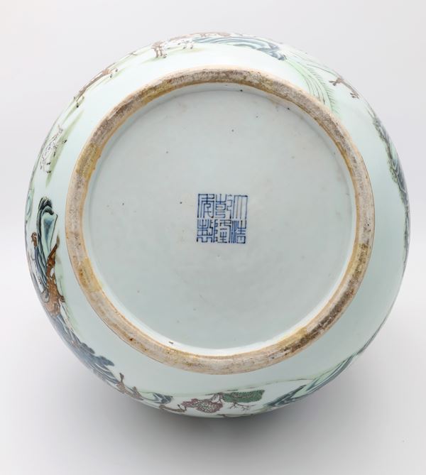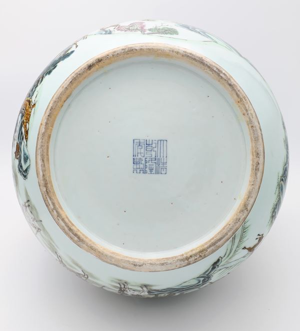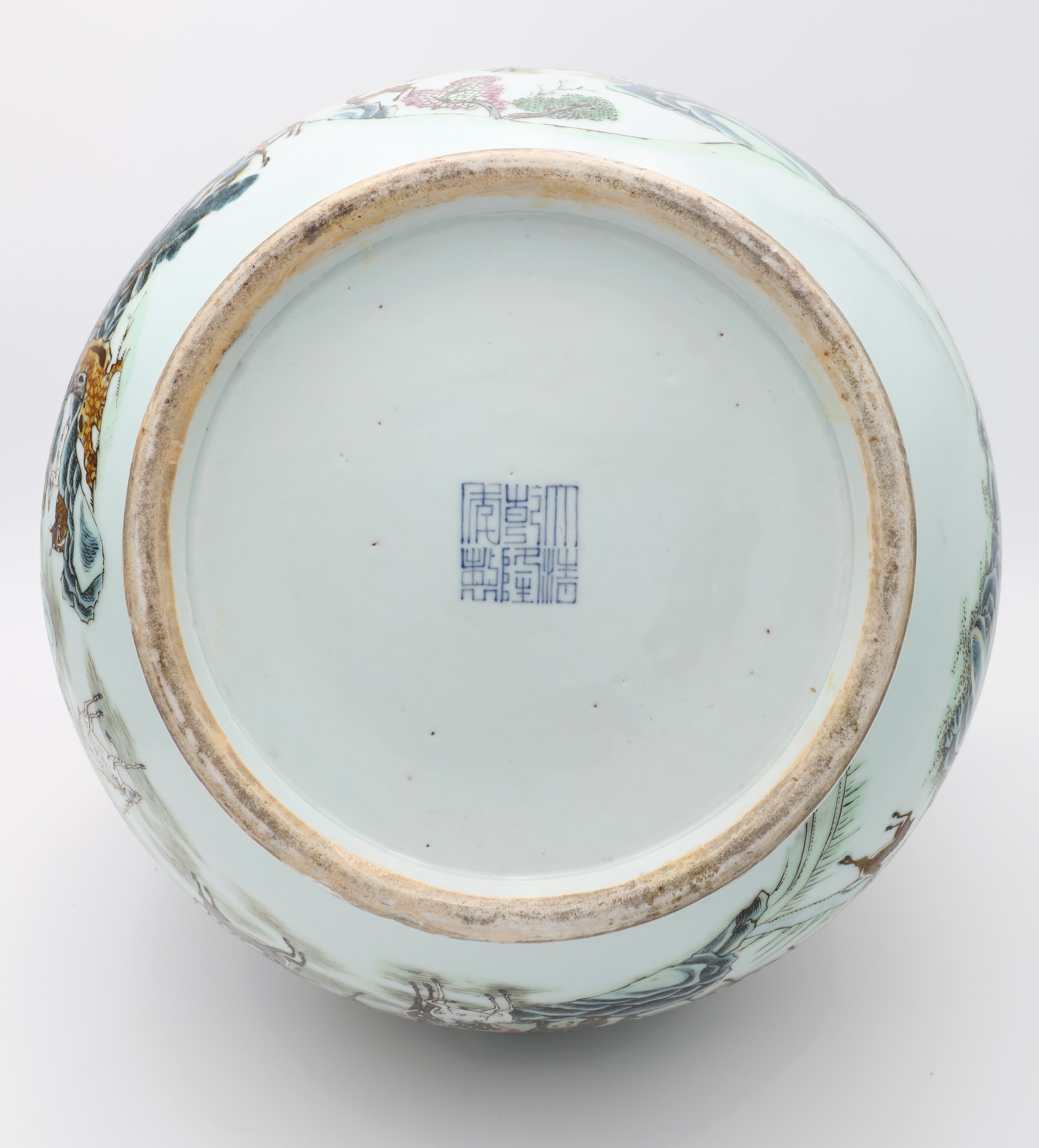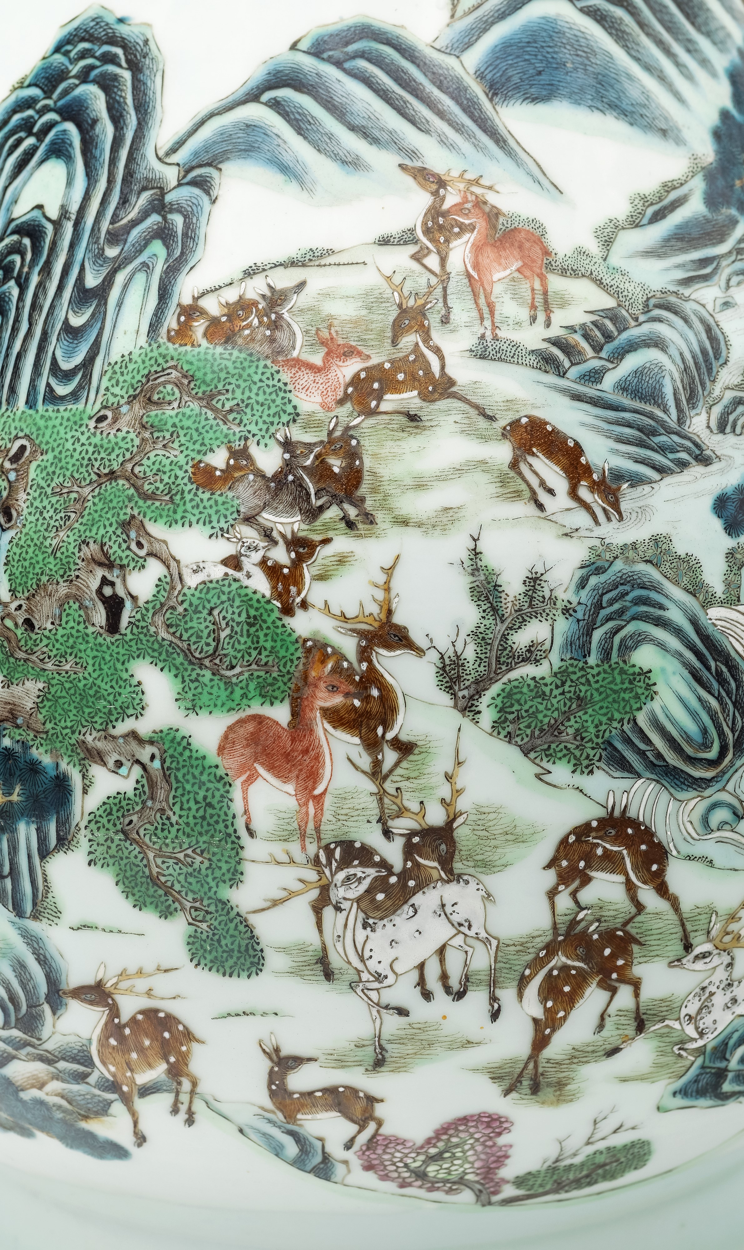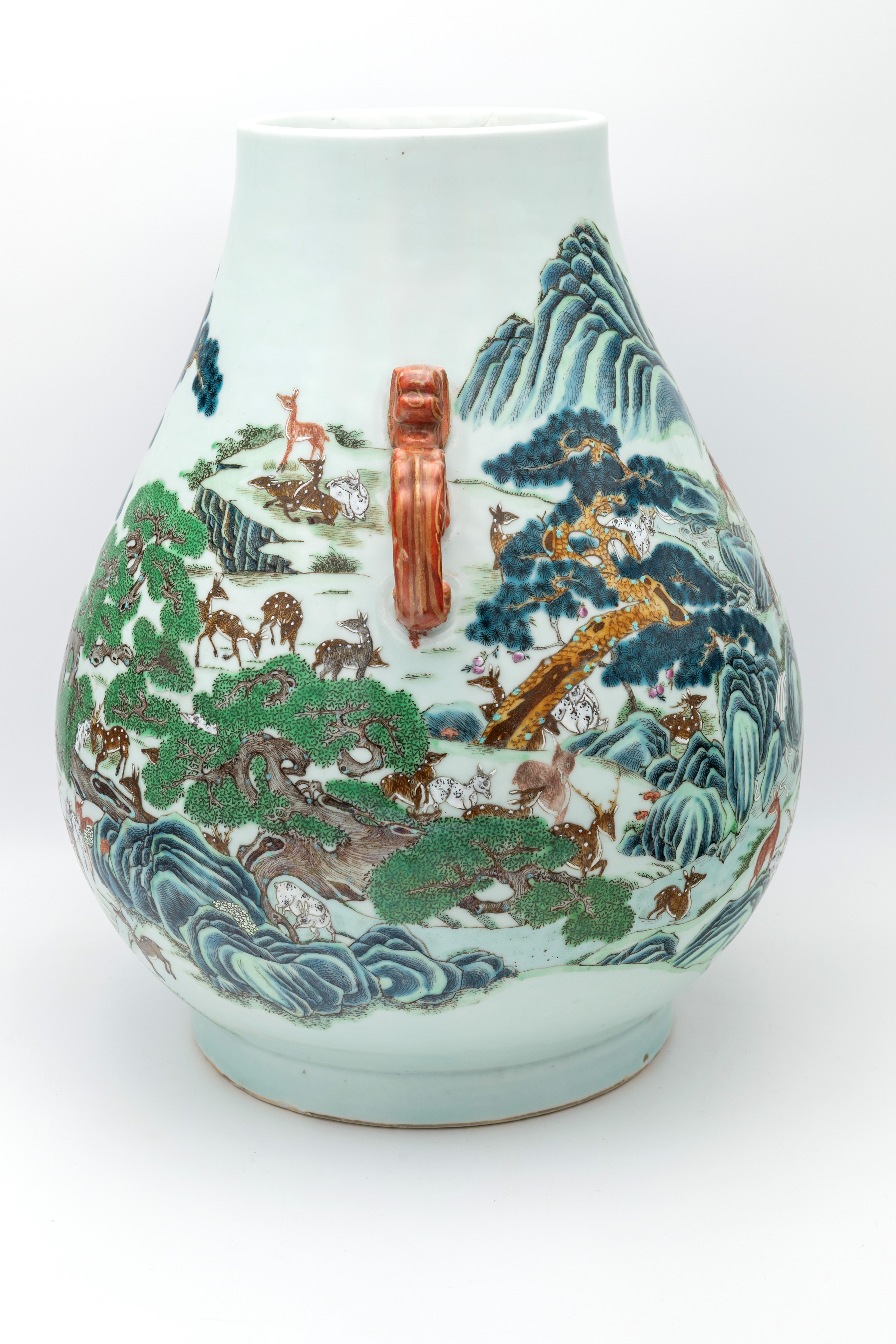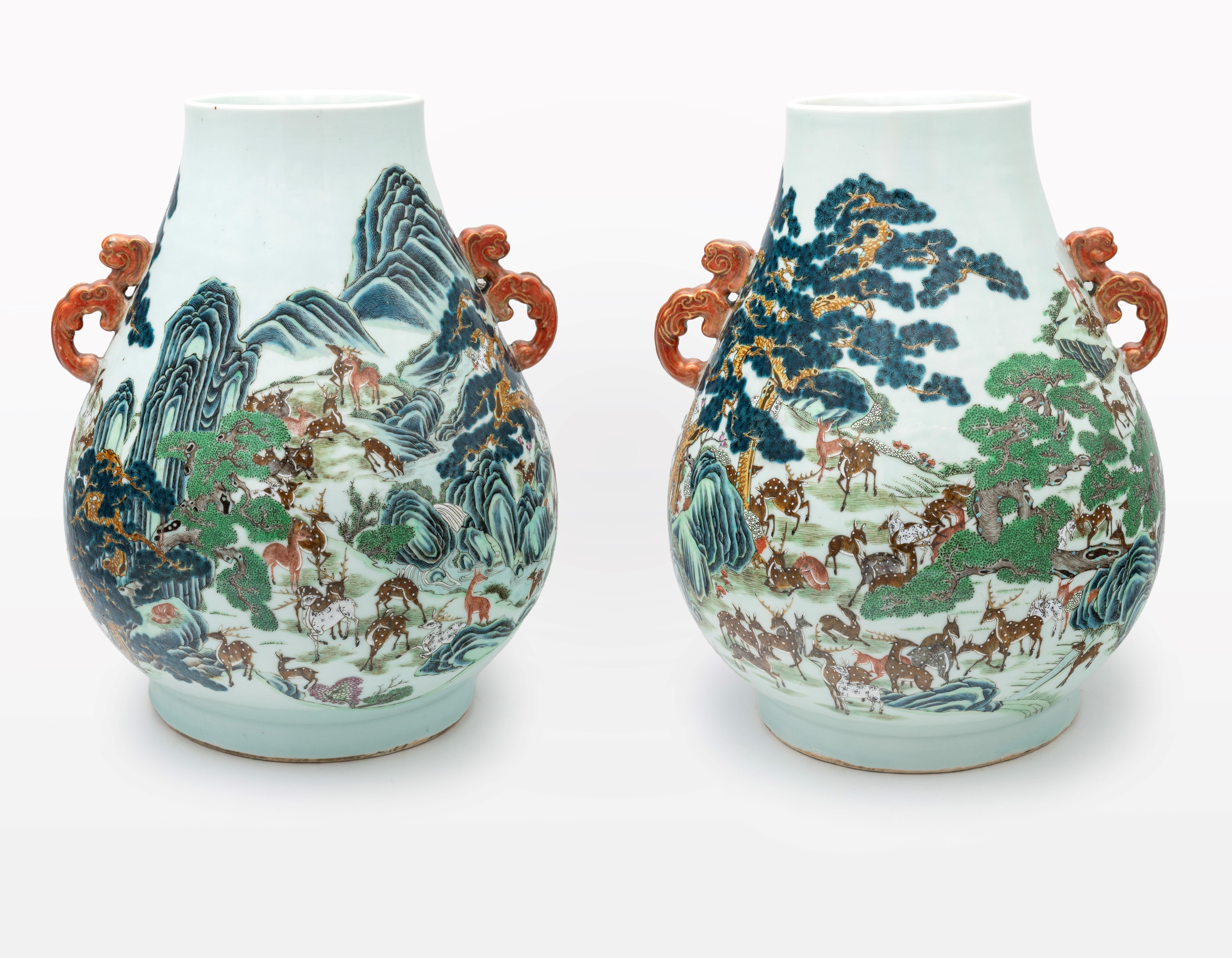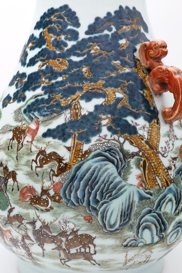Coppia di grandi vasi biansati "Hu" in porcellana con decoro "cento cervi", Cina, dinastia Qing, XIX secolo