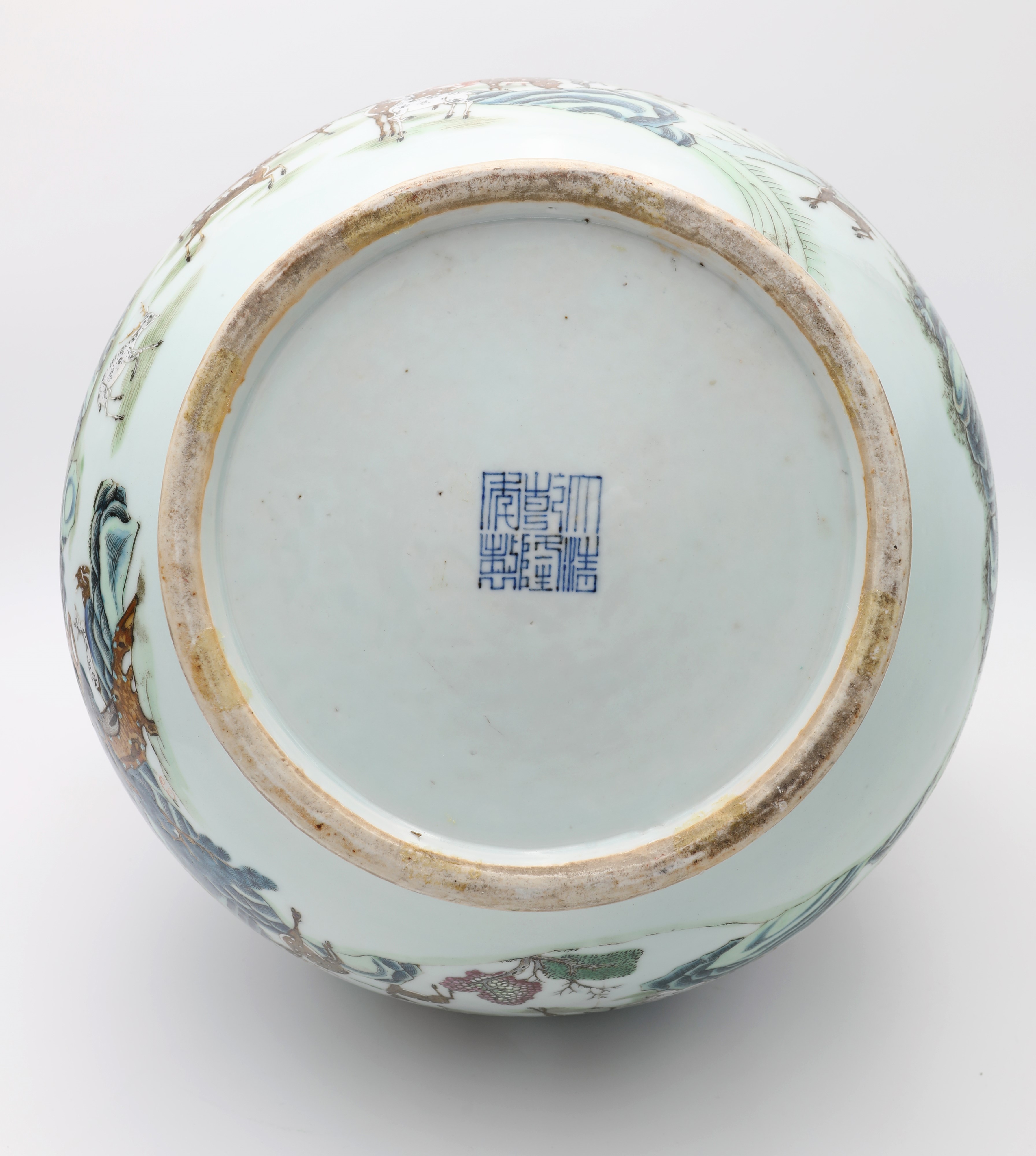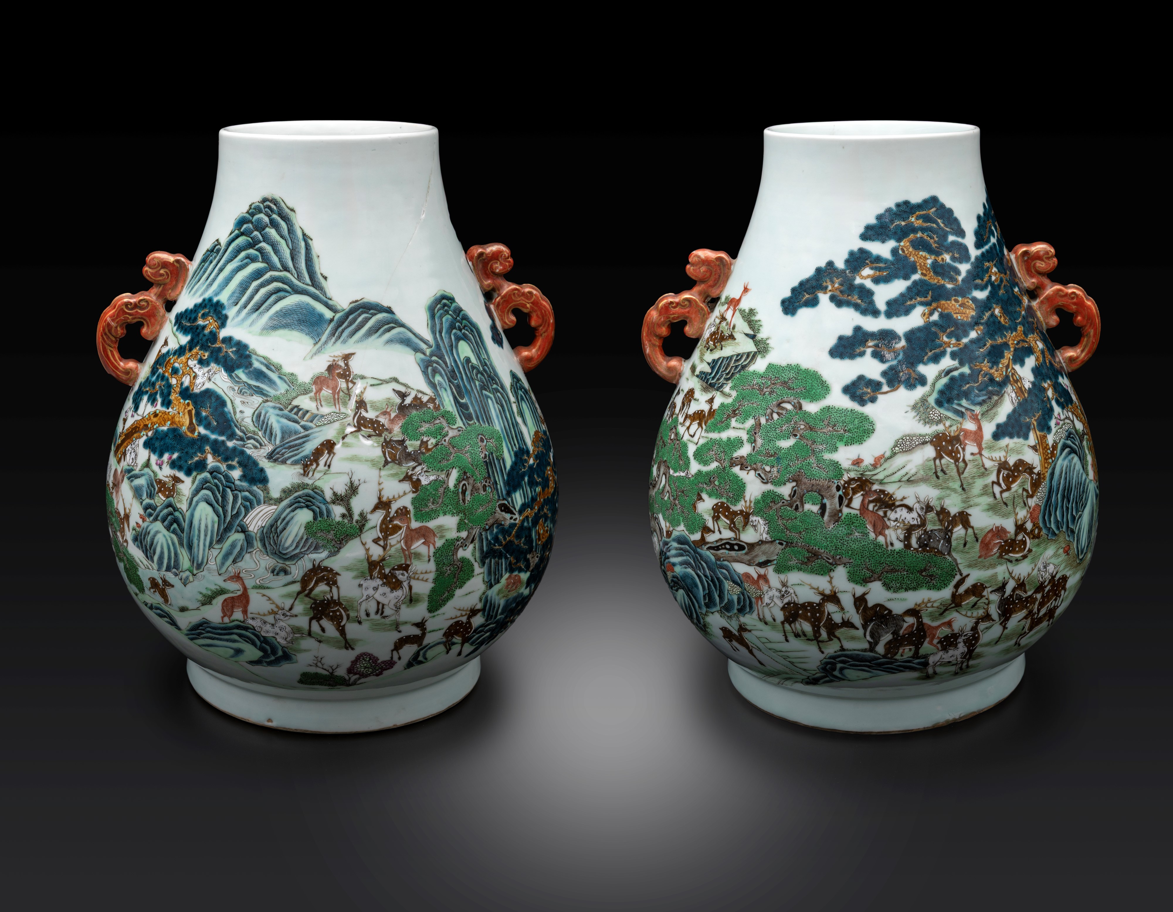 decorati a tutto tondo in toni realistici con paesaggi animati da figure sparse di cervi al pascolo e al galoppo; anse plastiche rosse a forma di drago stilizzato. Un vaso presenta una rottura con una piccolissima mancanza