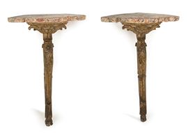 Coppia di piccole console ad angolo in legno dorato, Italia centrale, fine XVIII/inizio XIX secolo