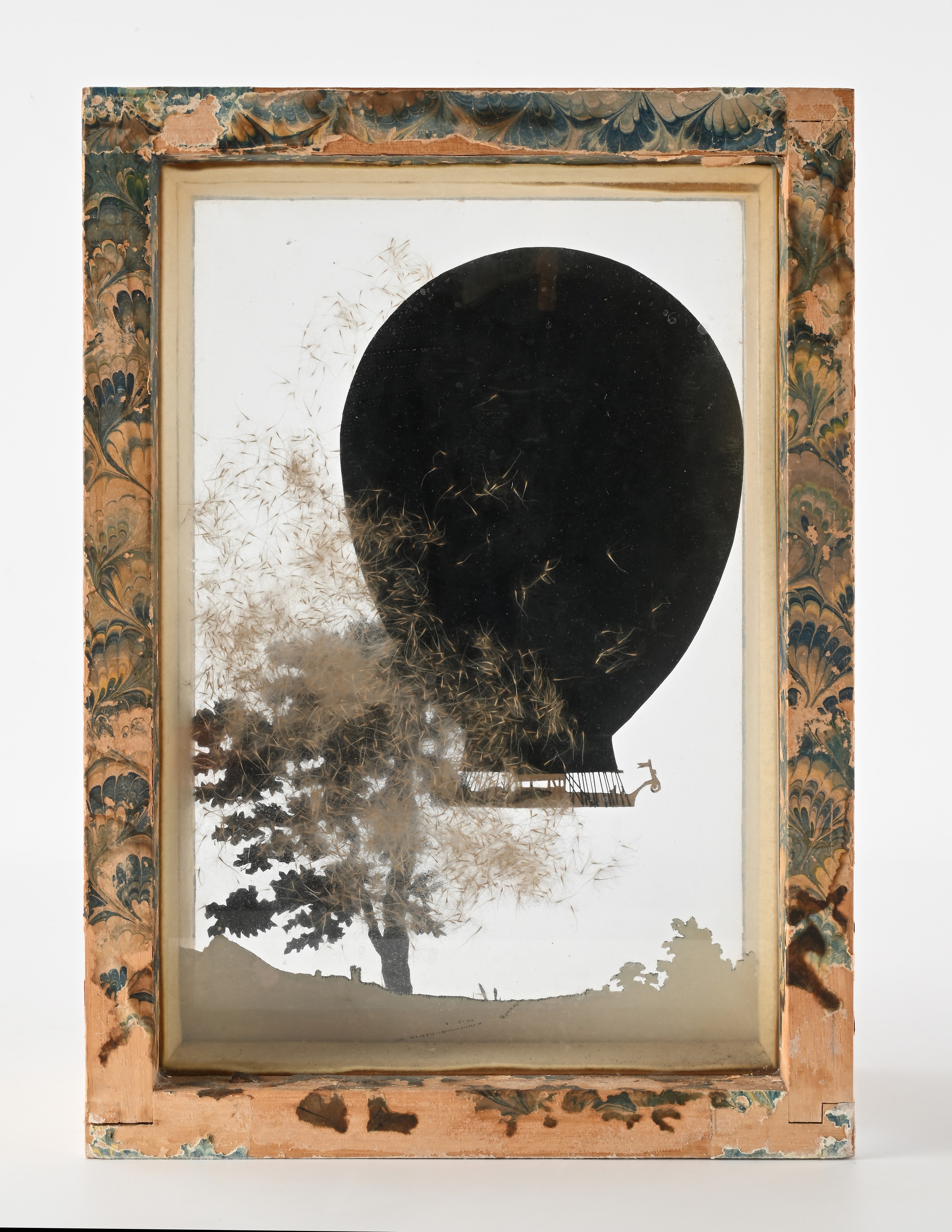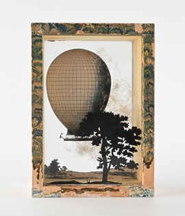 Diorama con mongolfiera in volo su sfondo di paesaggio