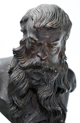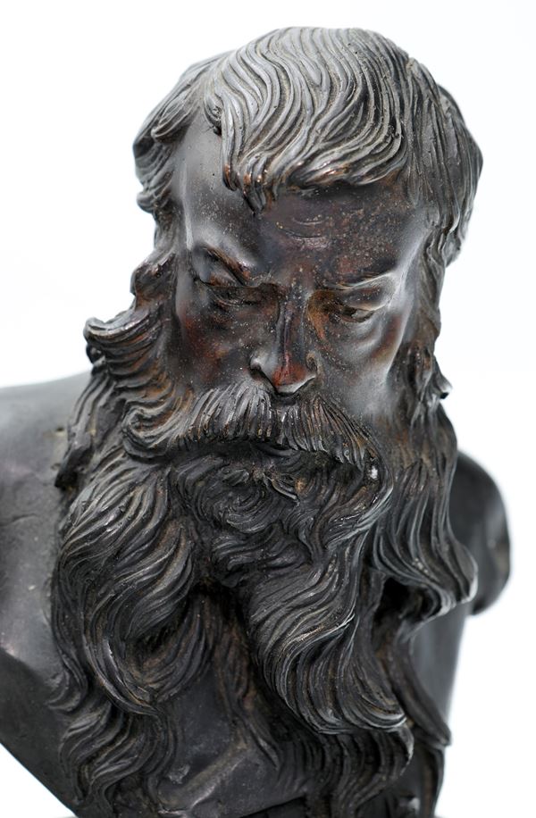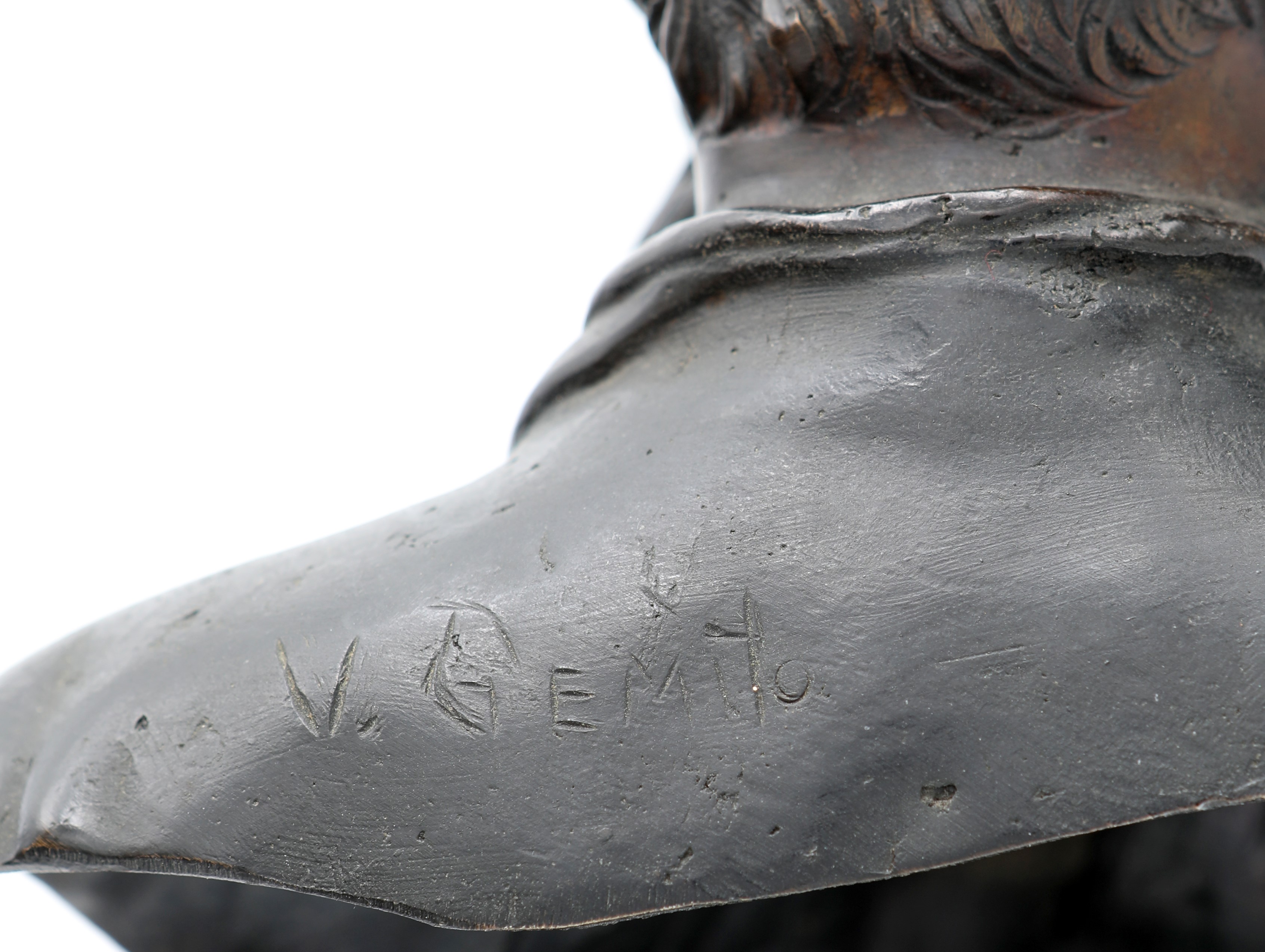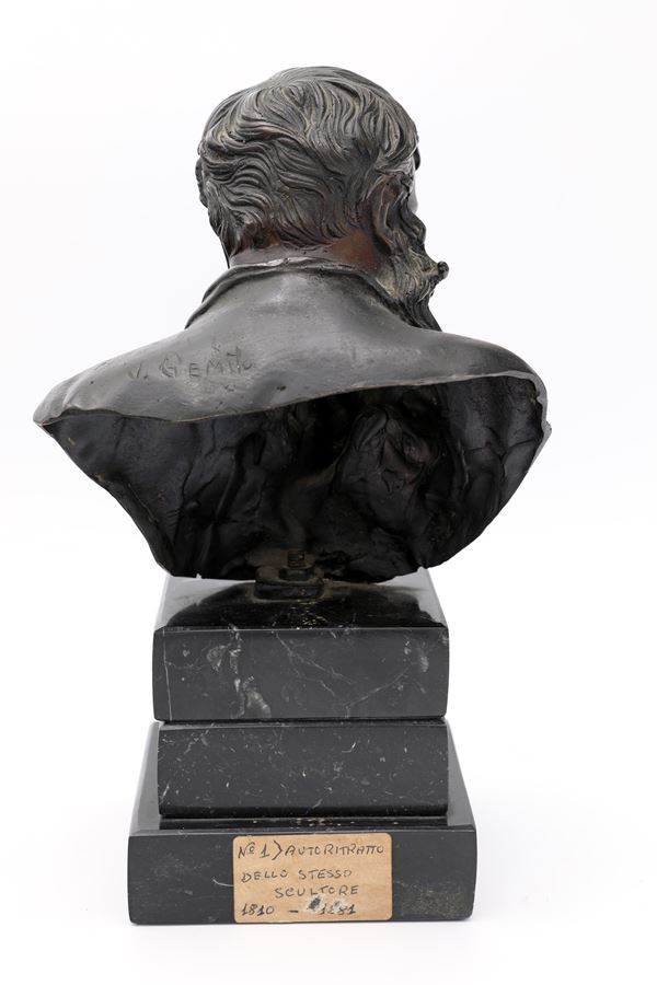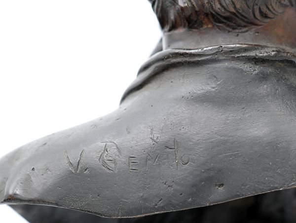 raffigurato a mezzo busto con la testa girata di tre quarti verso destra e la barba fluente sul panciotto. Iscritto al verso: V. Gemito. Base squadrata in marmo