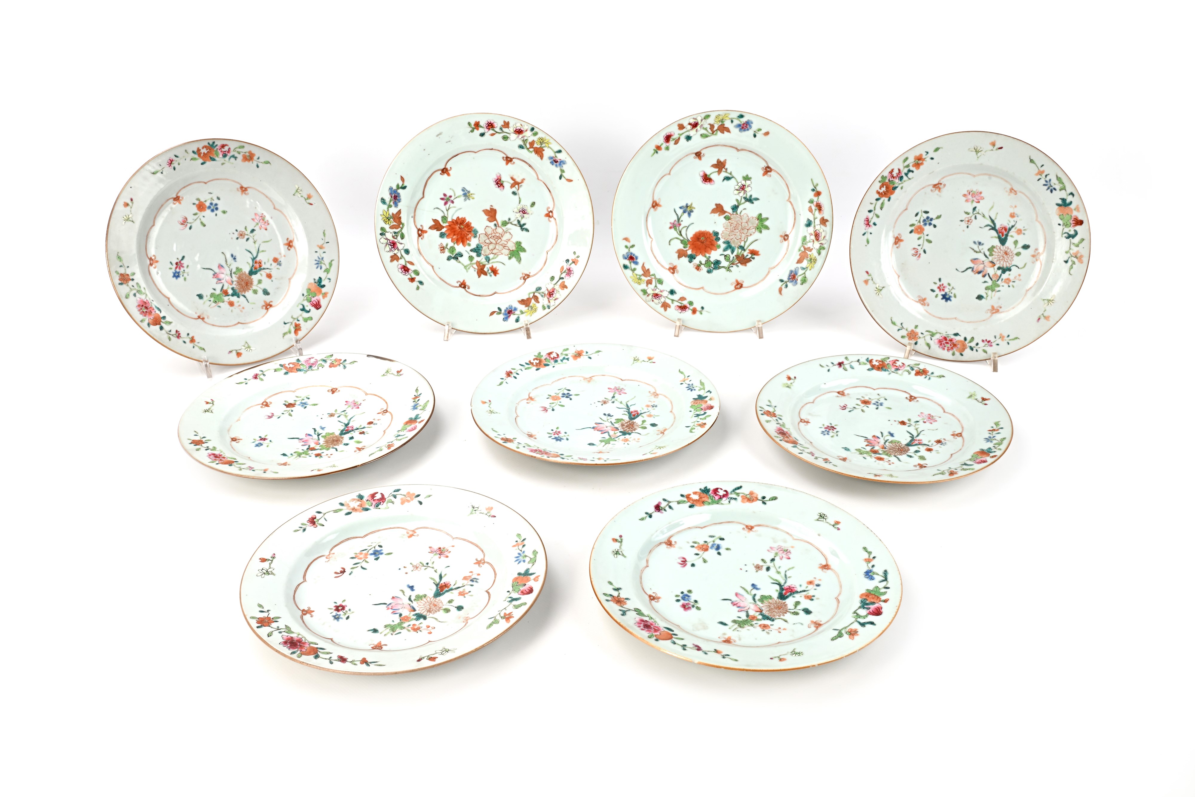 Nove piatti in porcellana policroma a motivi floreali, Compagnia delle Indie, XVIII secolo