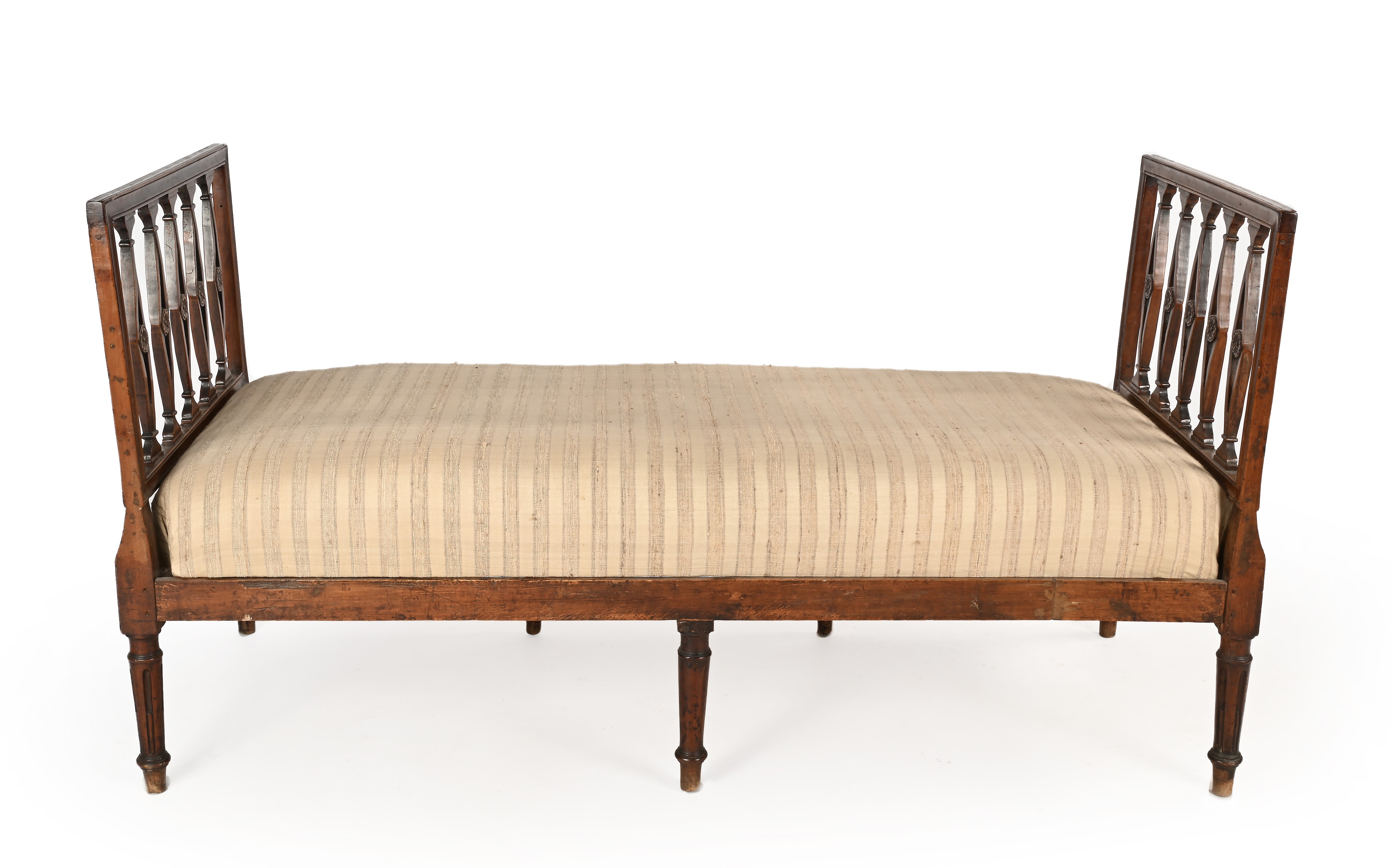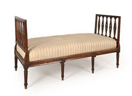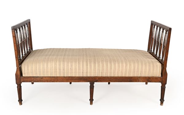 alte sponde laterali di linea squadrata con losanghe traforate centrate da corolle intagliate, seduta imbottita, schienale costituito da cuscini, gambe rastremate