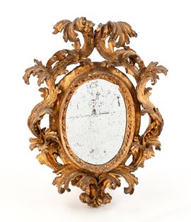 luce ovale contenente uno specchio antico circondata da ampie volute vegetali con estremità incurvate, riunite sulla sommità ed al vertice inferiore