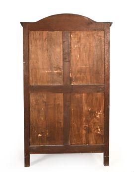 cimasa centinata centrata da rilievi vegetali intagliati, due ante frontali con pannelli sagomati a vetri e sottolineati da cornici modanata in incavo; grembiale curvilineo, piedi mossi terminanti a ricciolo