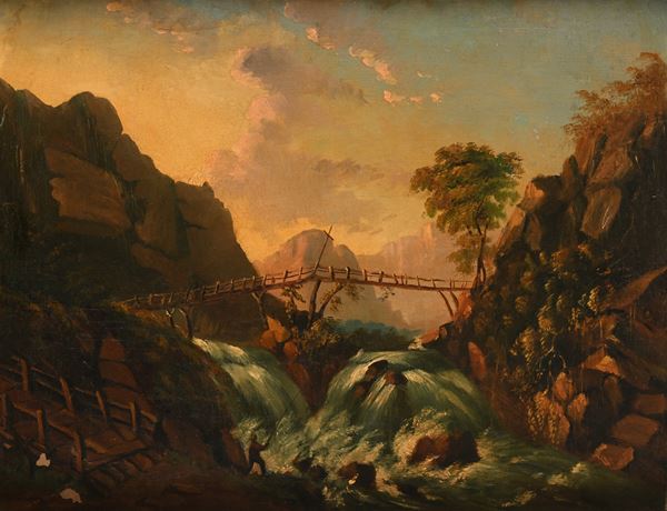 Paesaggio nordico con ponte di legno e cascata