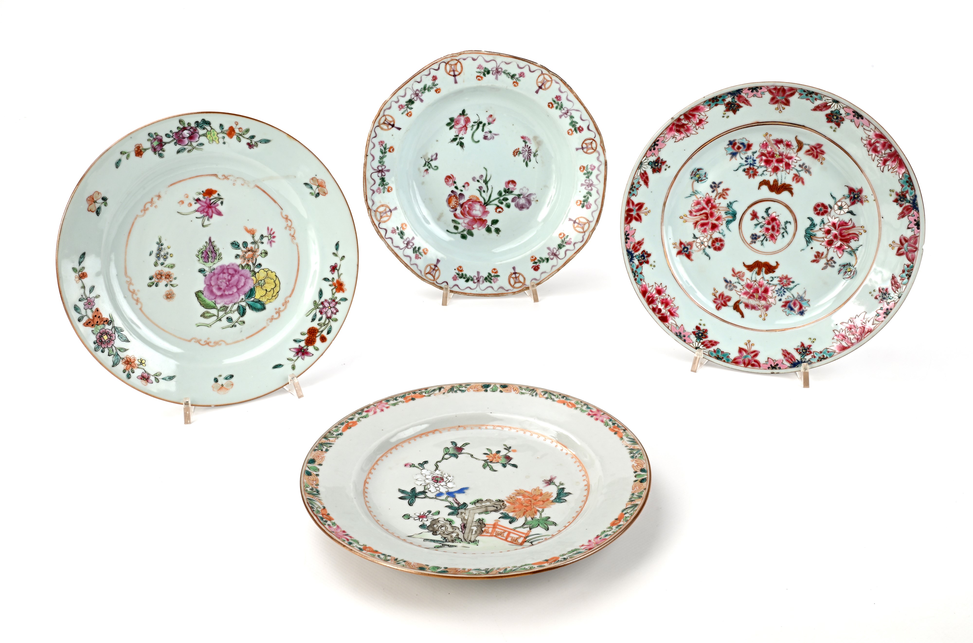 Quattro piatti diversi in porcellana policroma e dorata, Compagnia delle Indie, XVIII secolo