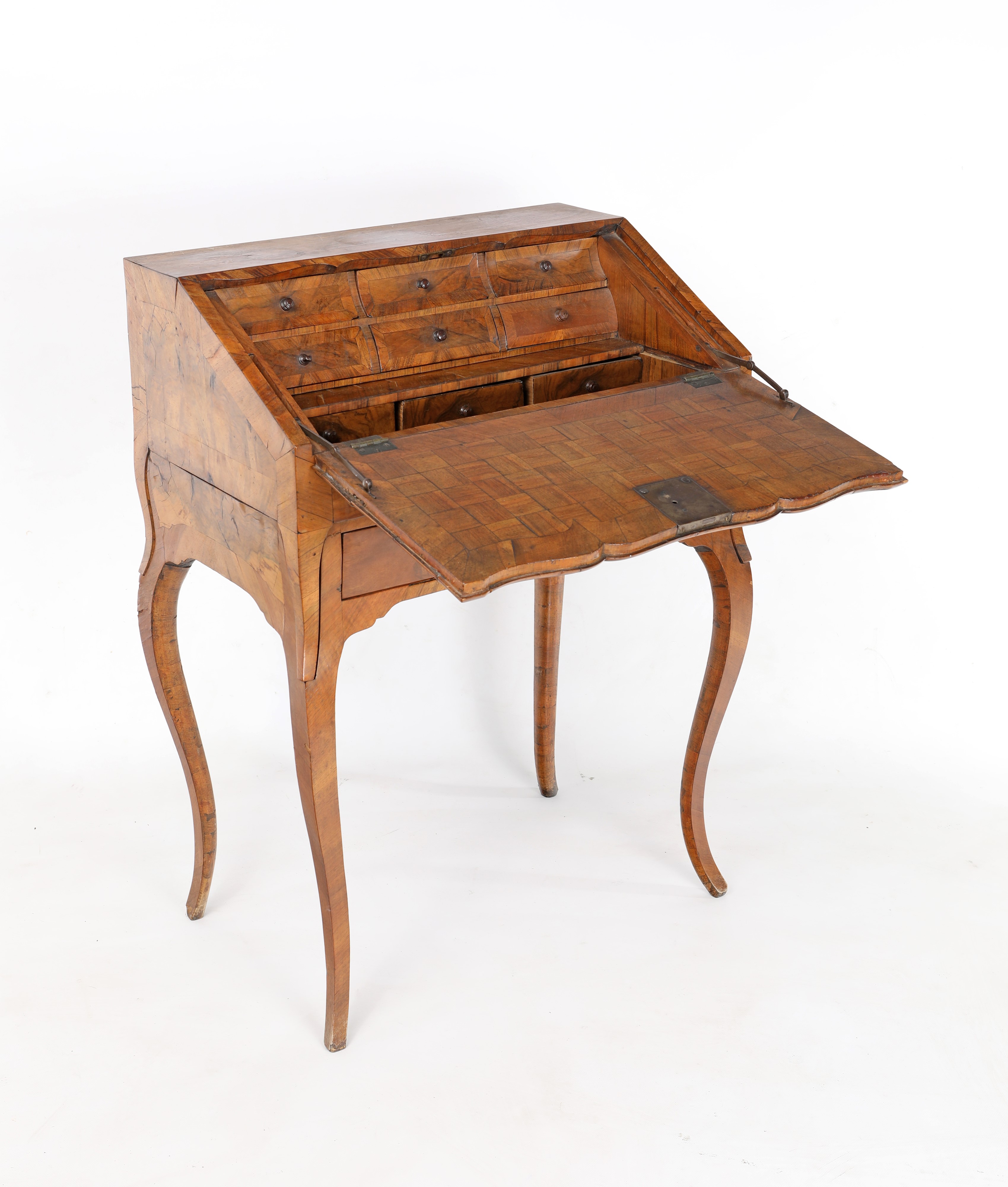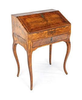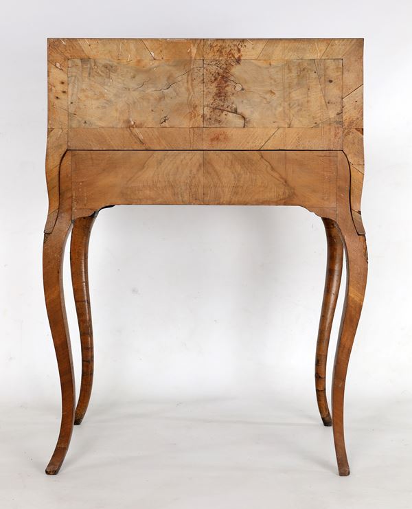 Raro scrittoio a ribalta in noce e radica di noce a doppio uso, Italia settentrionale, metà del XVIII secolo