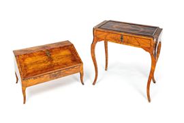 Questo scrittoio presenta la possibilità di scomporsi in due per essere utilizzato a letto come scrittoio e a parete o in centro come normale scrivania. Il tavolo che rimane a terra, con cassetto frontale, è centrato sul piano da una tarsia racchiusa da un cordolo in rilievo ed è caratterizzato da spigoli concavi e modanati in cui si inseriscono le quattro gambe che sostengono la parte superiore; quest'ultima reca un'anta a ribalta intarsiata a marqueterie geometrica; all'interno sei tiretti sagomati e piano scorrevole con vano interno; gambe mosse