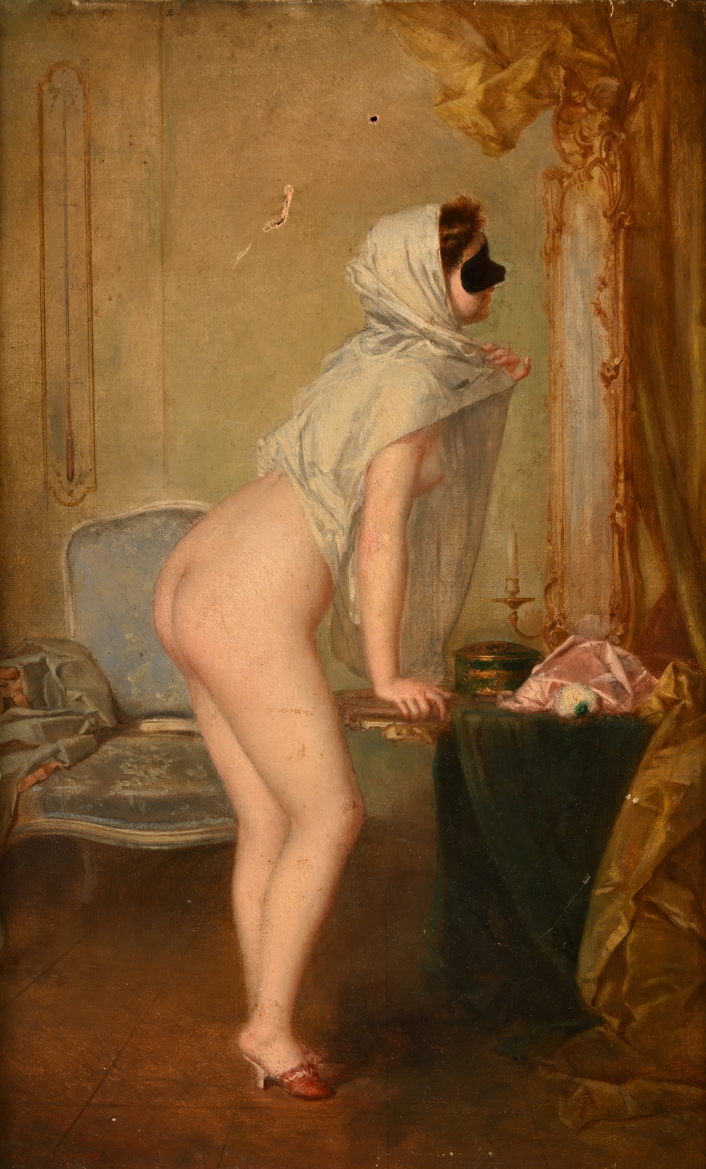 Interno con figura femminile nuda con velo e maschera che si specchia