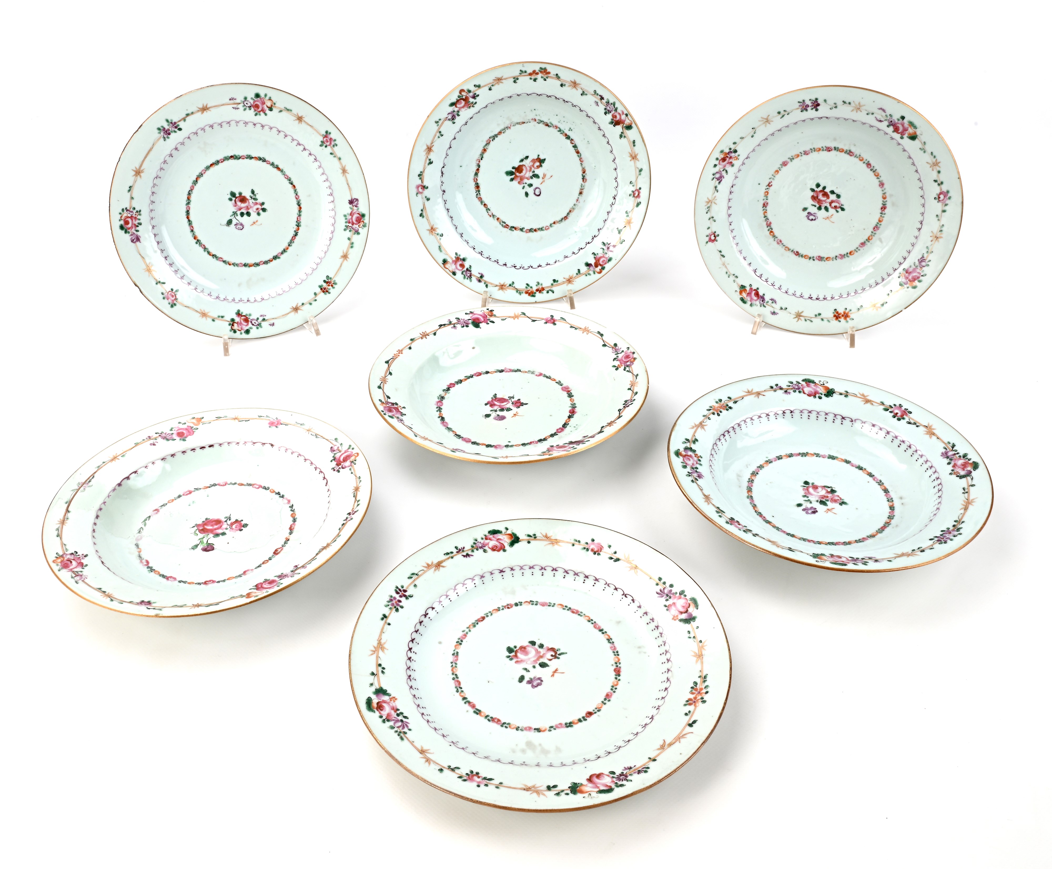 Sette piatti in porcellana policroma con ghirlande e rose, Compagnia delle Indie, XVIII secolo