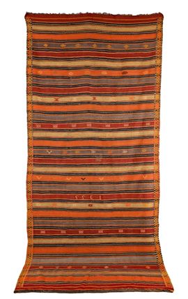 classico esempio dell’arte tessile berbera del Nord Africa, caratterizzato dalla sua tessitura piatta e dalla vivace alternanza di bande orizzontali nei toni dell’arancione, del rosso e del beige, arricchite da piccoli dettagli geometrici e simbolici. La lavorazione in lana naturale conferisce a questo tappeto una grande resistenza e versatilità, rendendolo ideale per ambienti etnici o moderni.