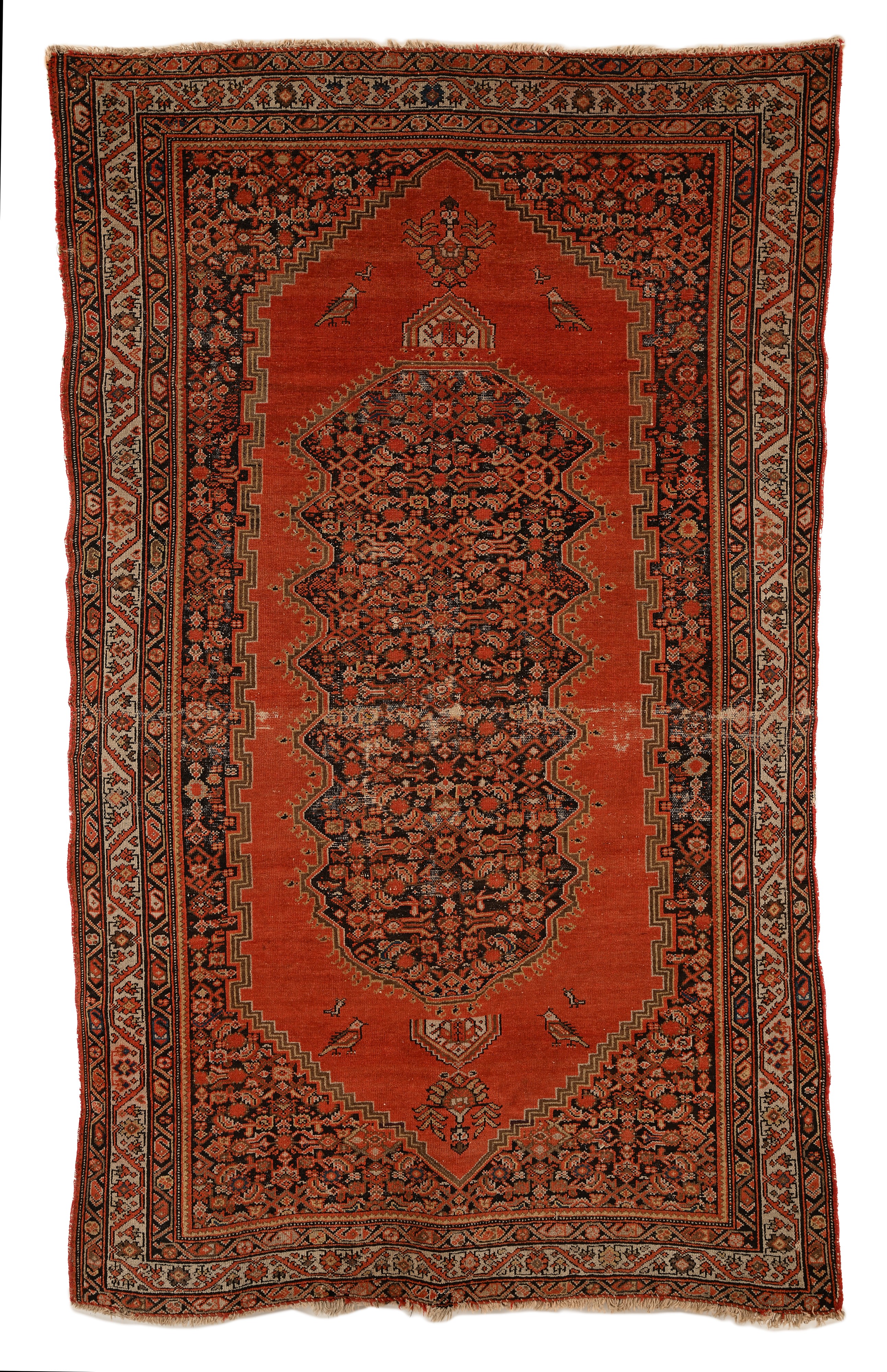 medaglione centrale cuspidato con profilo mistilineo e fitto disegno stilizzato su fondo nero ripetuto lungo la cornice e agli angoli; molteplici bordure. Difetti