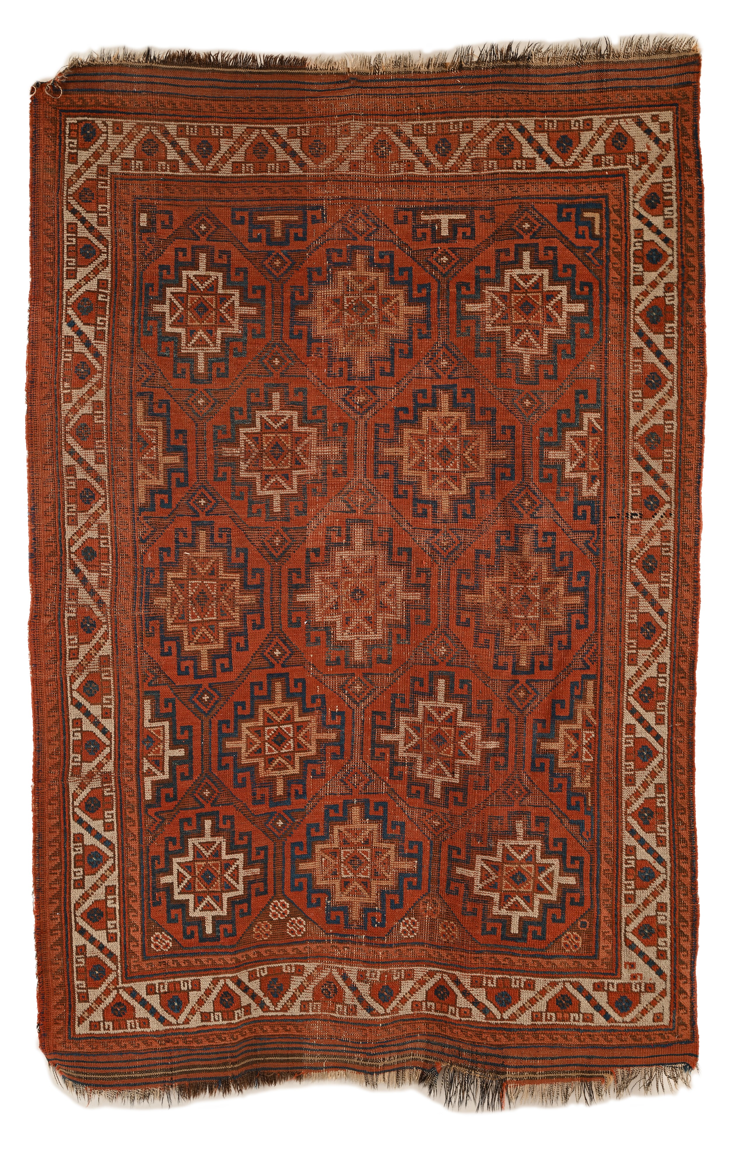 La bordura è decorata con motivi a losanga e dettagli tribali stilizzati su sfondo avorio, creando un interessante contrasto con il campo principale in rosso ruggine. Molto usurato